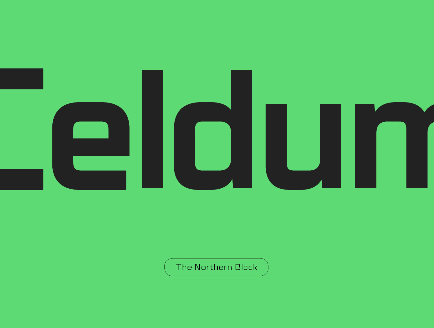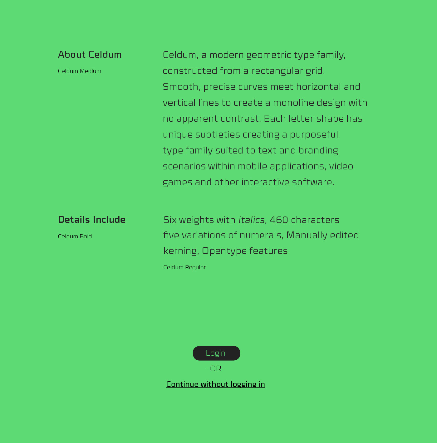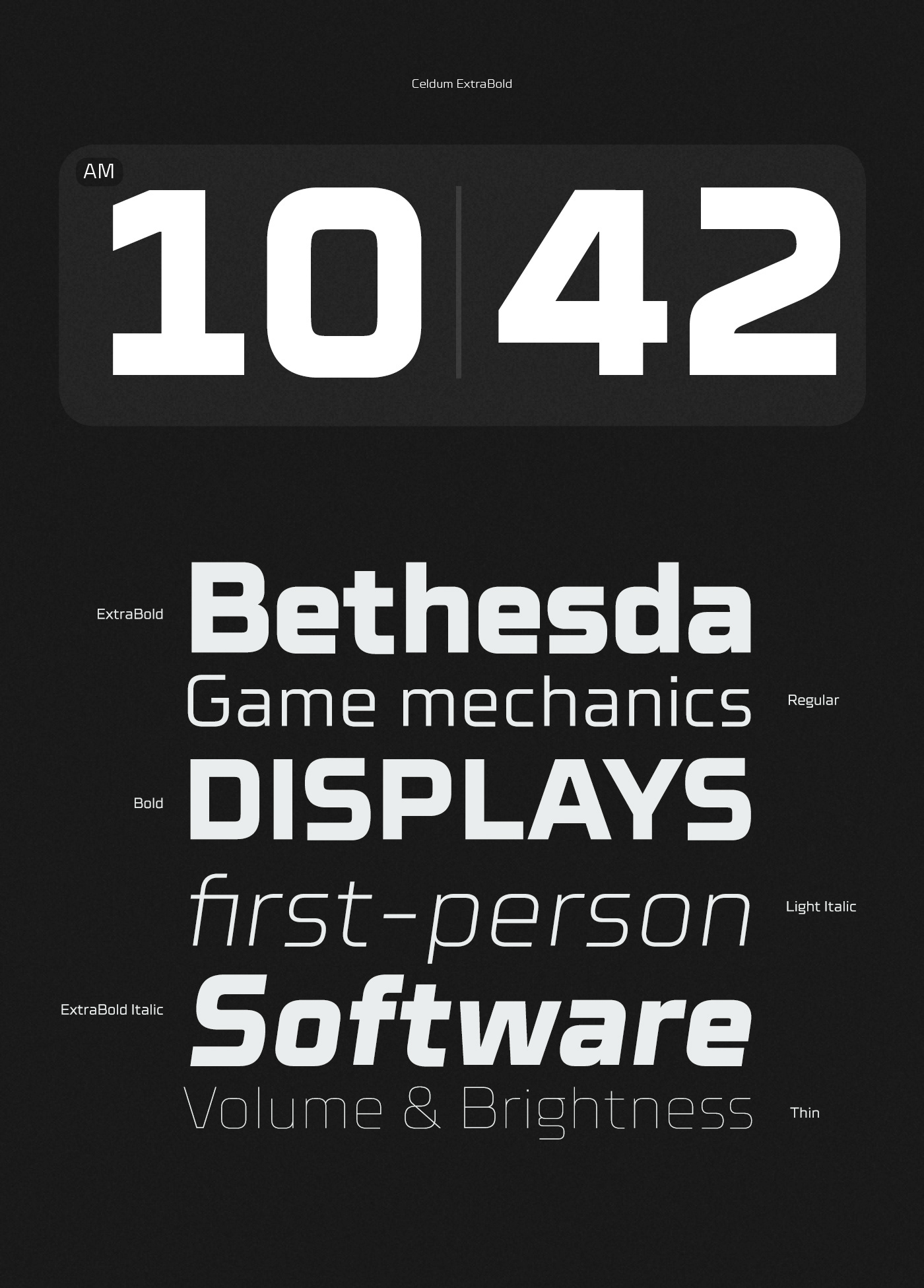 Celdum, a modern geometric type family, constructed from a rectangular grid. Smooth, precise curves meet horizontal and vertical lines to create a monoline design with no apparent contrast. Each letter shape has unique subtleties creating a purposeful type family suited to text and branding scenarios within mobile applications, video games and other interactive software. Details include six weights with italics, 460 characters, five variations of numerals, manually edited kerning and Opentype features.