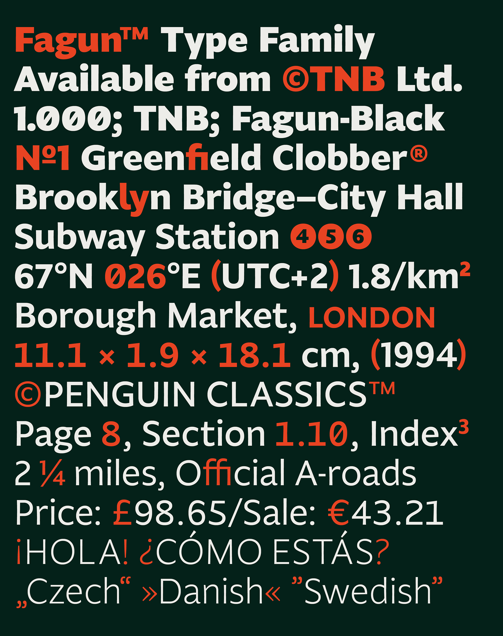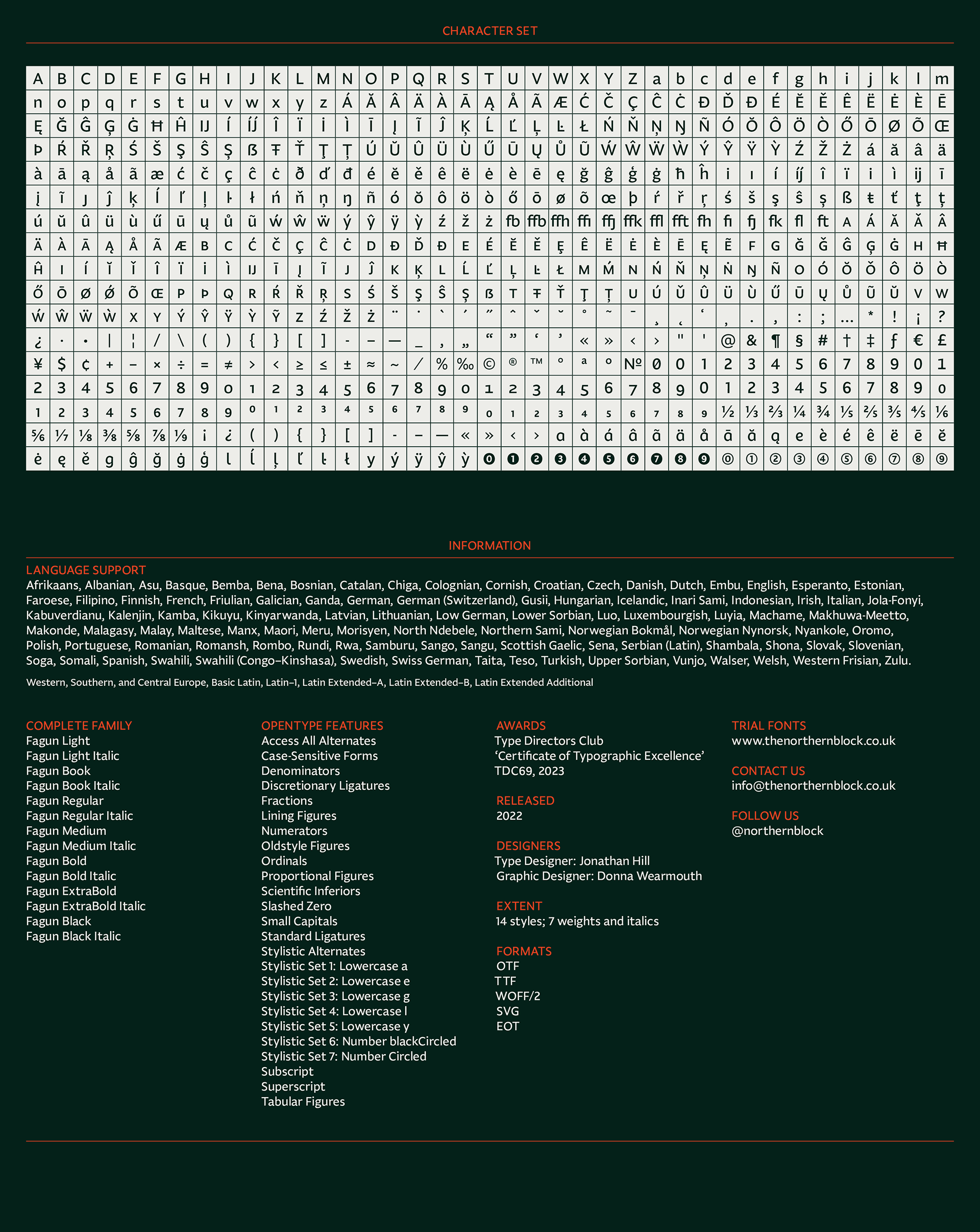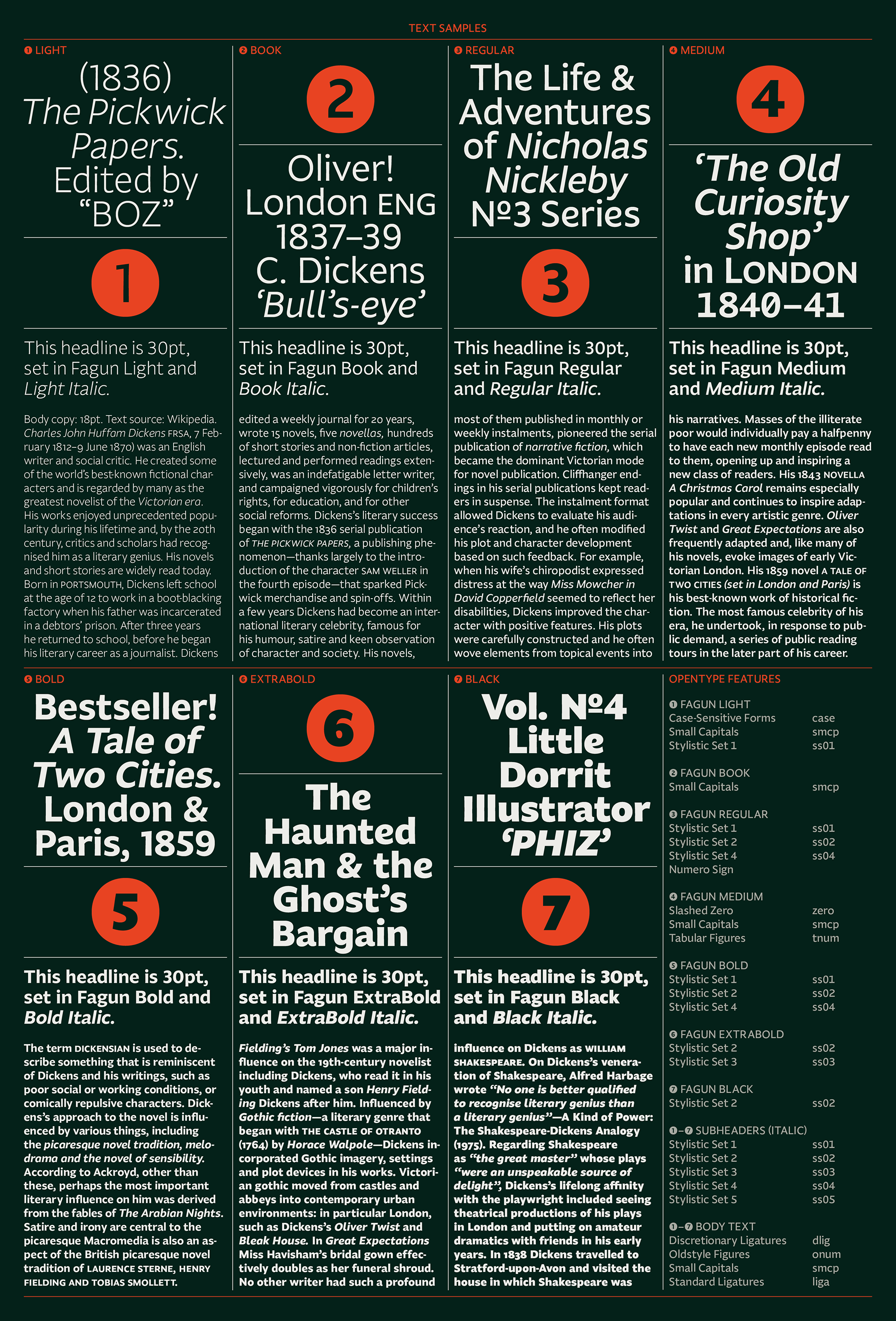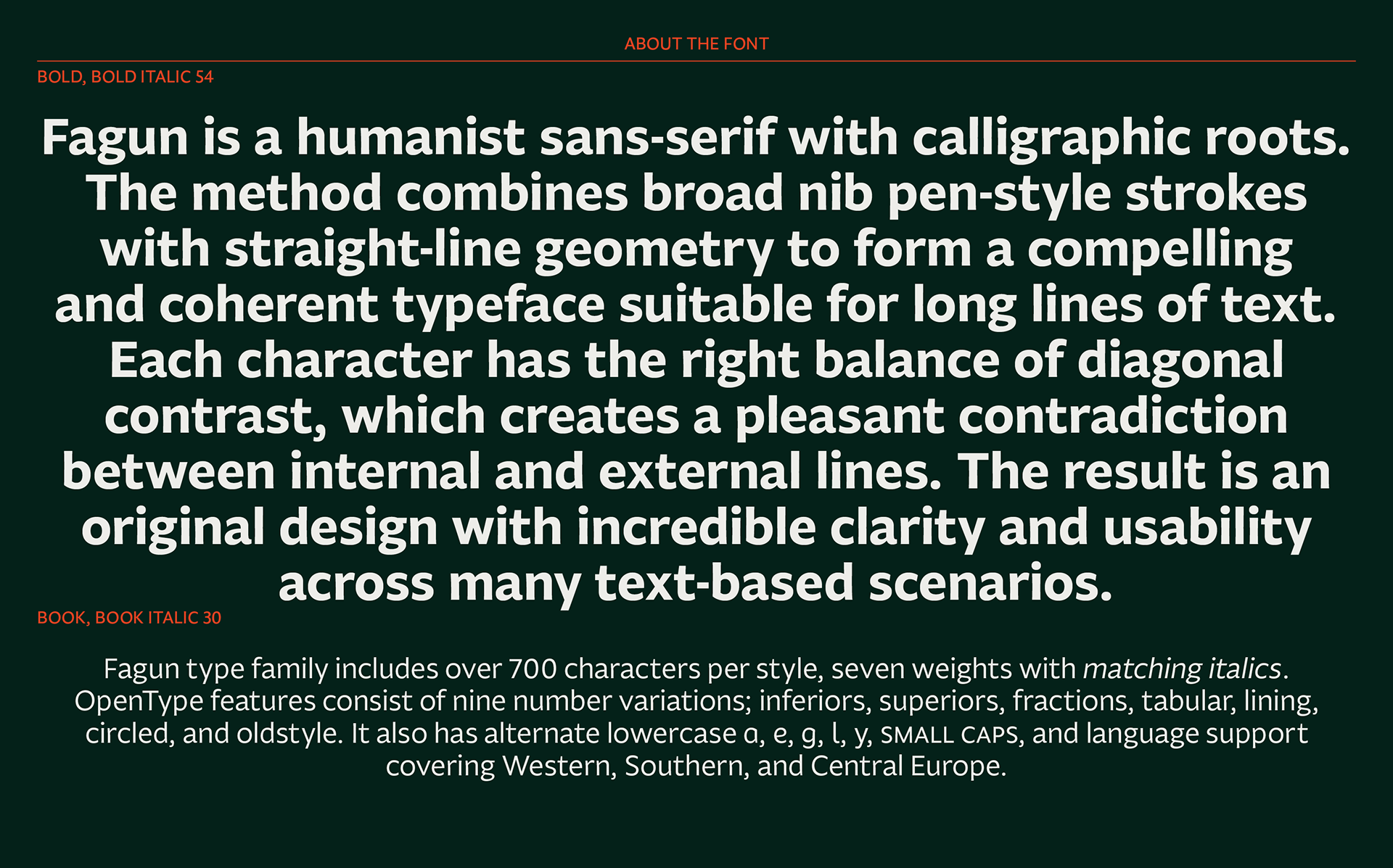 Fagun is a humanist sans-serif with calligraphic roots. The method combines broad nib pen-style strokes with straight-line geometry to form a compelling and coherent typeface suitable for long lines of text.
