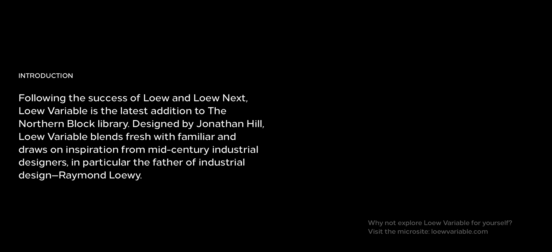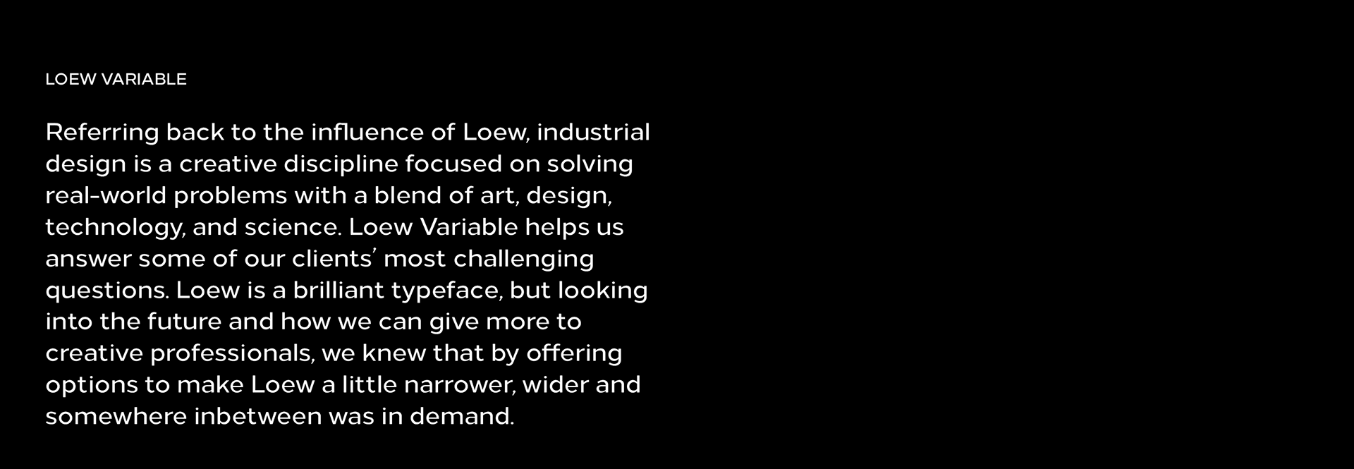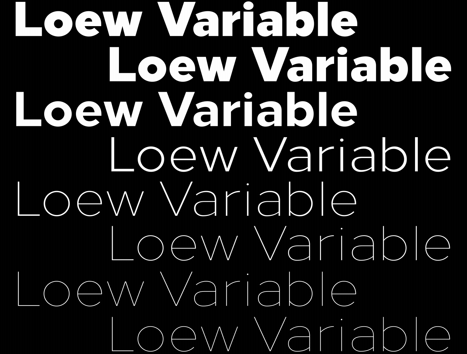 Loew Variable is a geometric sans serif typeface influenced by the early industrial designers. Pure mechanical shapes are carefully adjusted to give the characters the correct form, function and usability. These subtle human touches combined with the technical detail, provide excellent readability at large and small point sizes. In 2022 Loew was made into a variable format within a single font file. It contains all the weights of Loew plus any style in-between. It also includes condensed widths to work in narrow spaces without overstretching and extended widths that command attention across physical objects and large scale print.