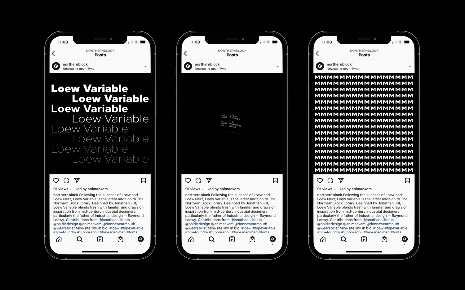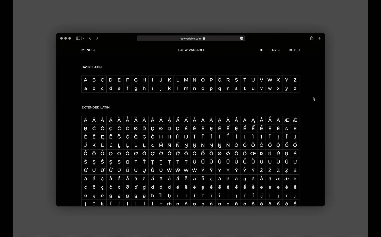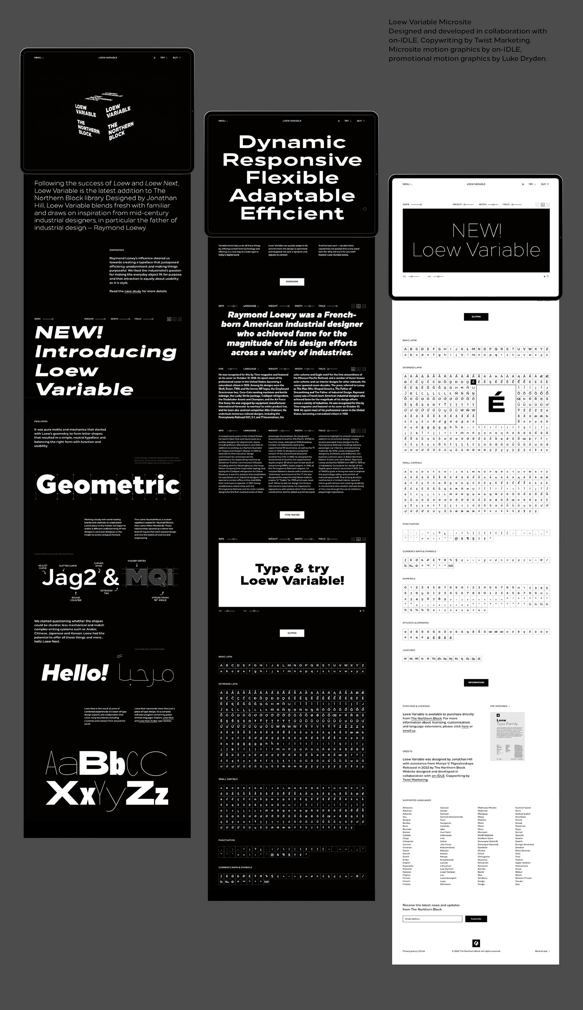 Loew Variable is a geometric sans serif typeface influenced by the early industrial designers. Pure mechanical shapes are carefully adjusted to give the characters the correct form, function and usability. These subtle human touches combined with the technical detail, provide excellent readability at large and small point sizes. In 2022 Loew was made into a variable format within a single font file. It contains all the weights of Loew plus any style in-between. It also includes condensed widths to work in narrow spaces without overstretching and extended widths that command attention across physical objects and large scale print.