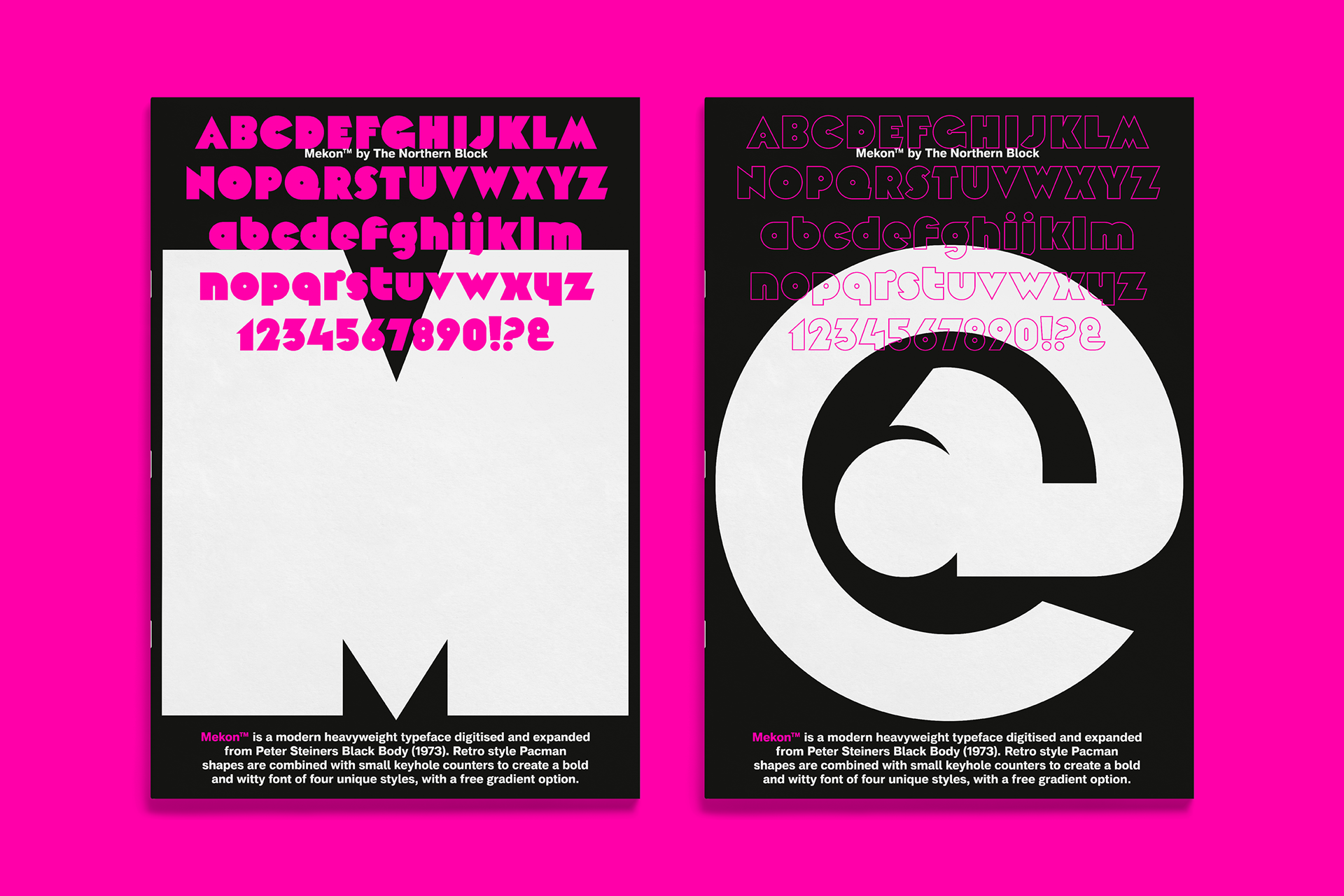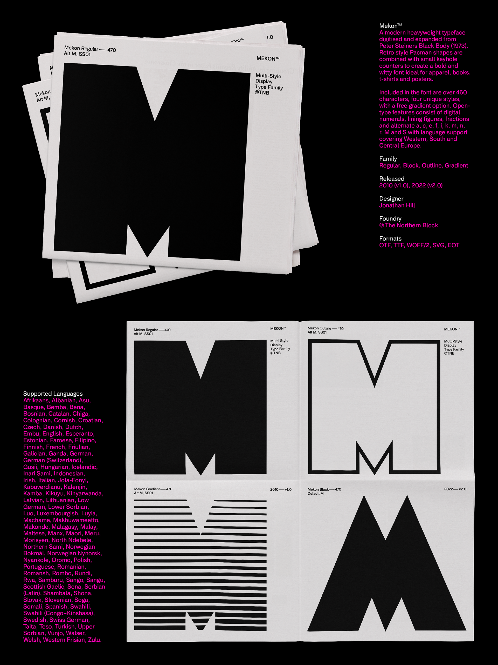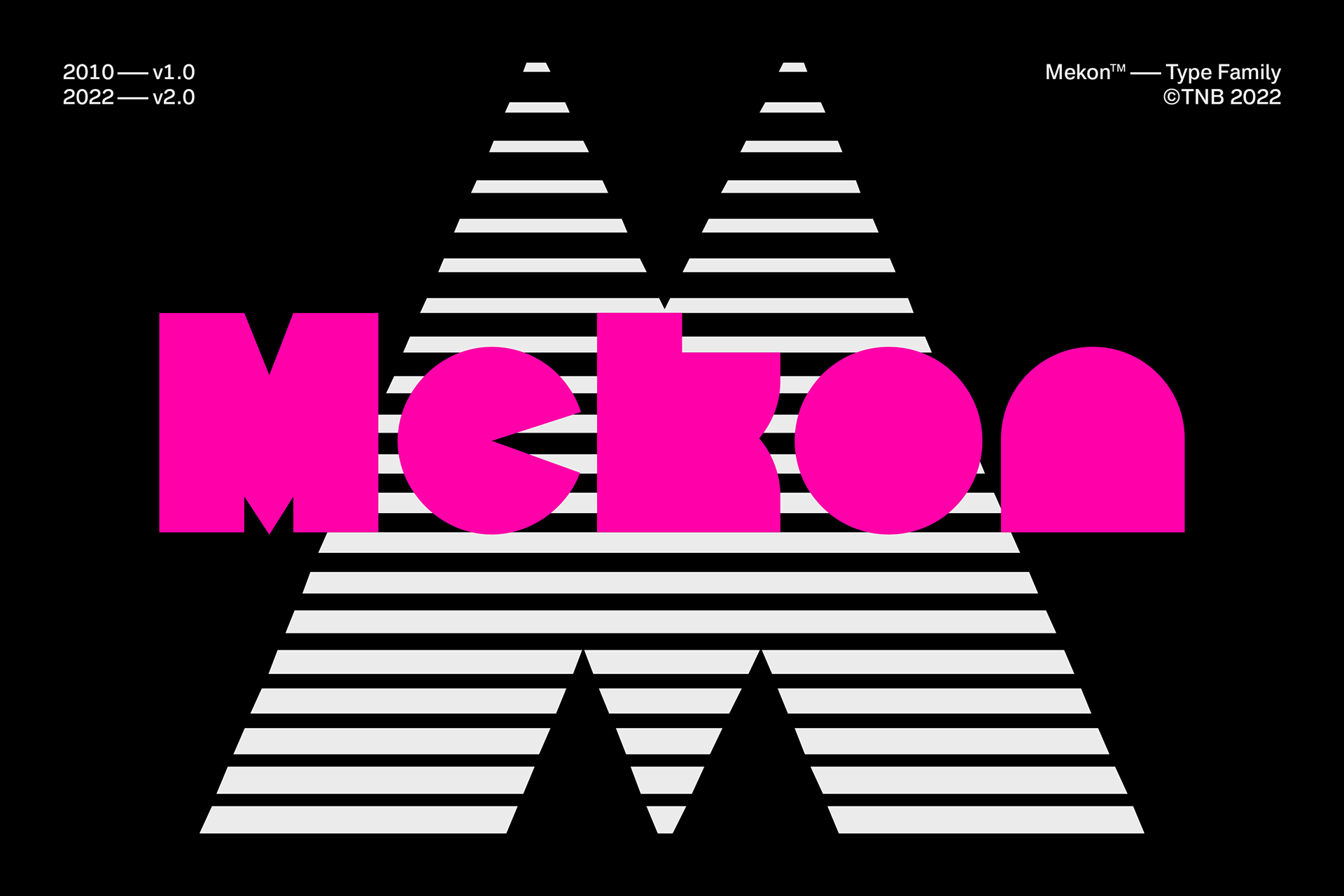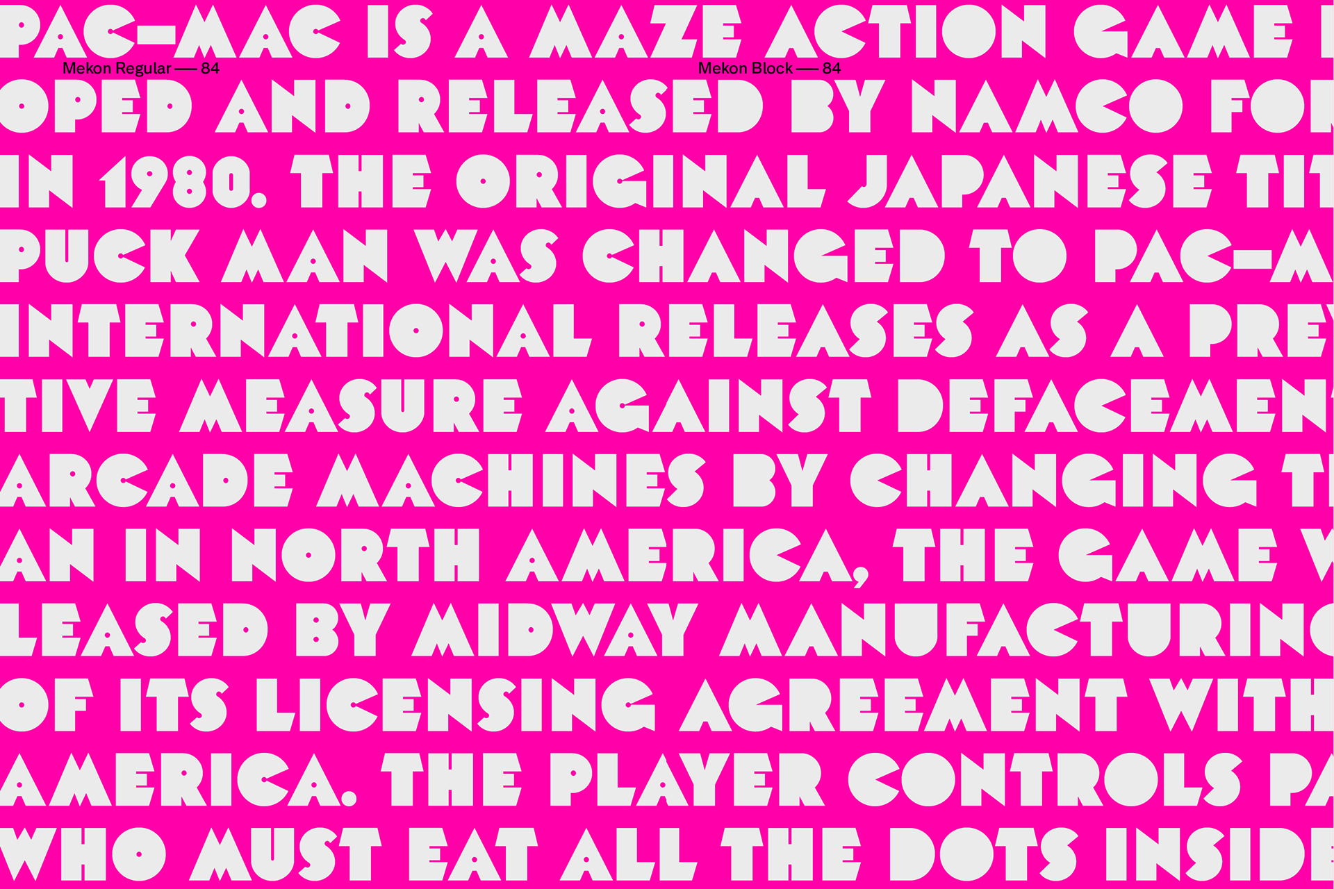 Mekon is a modern heavyweight typeface digitised and expanded from Peter Steiners Black Body (1973). Retro-style Pacman shapes are combined with small keyhole counters to create a bold and witty font ideal for apparel, books, t-shirts and posters.