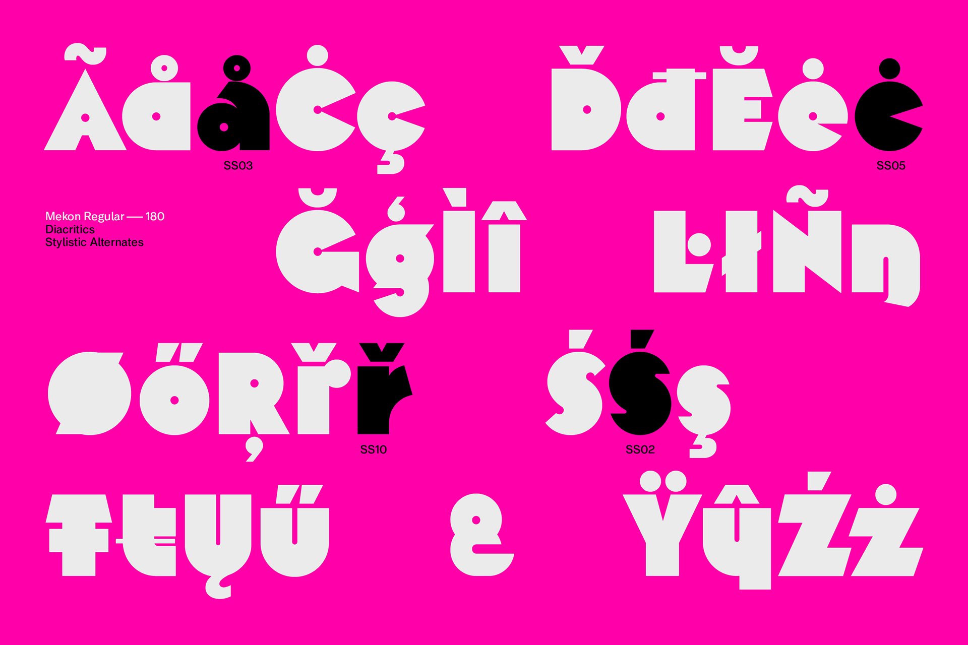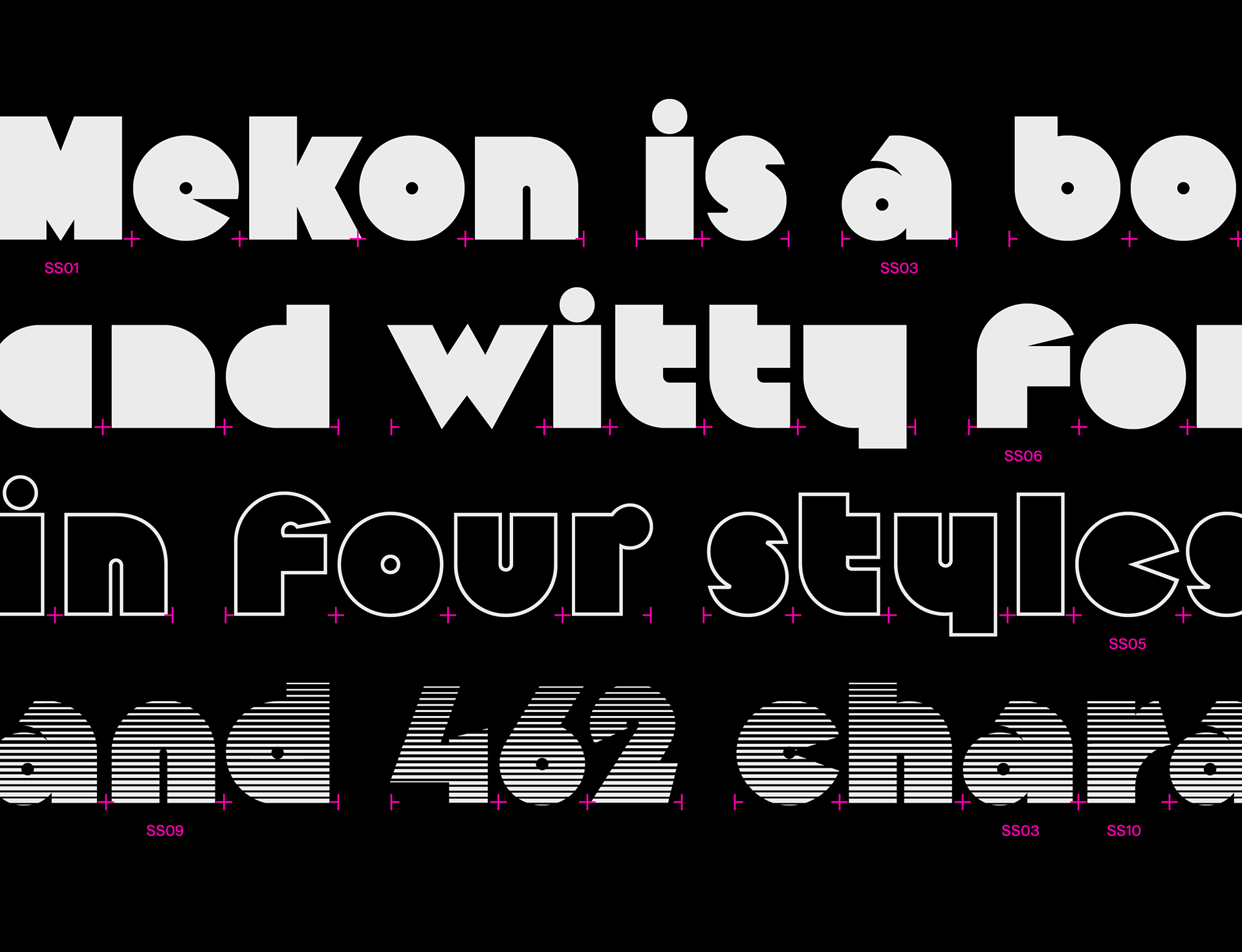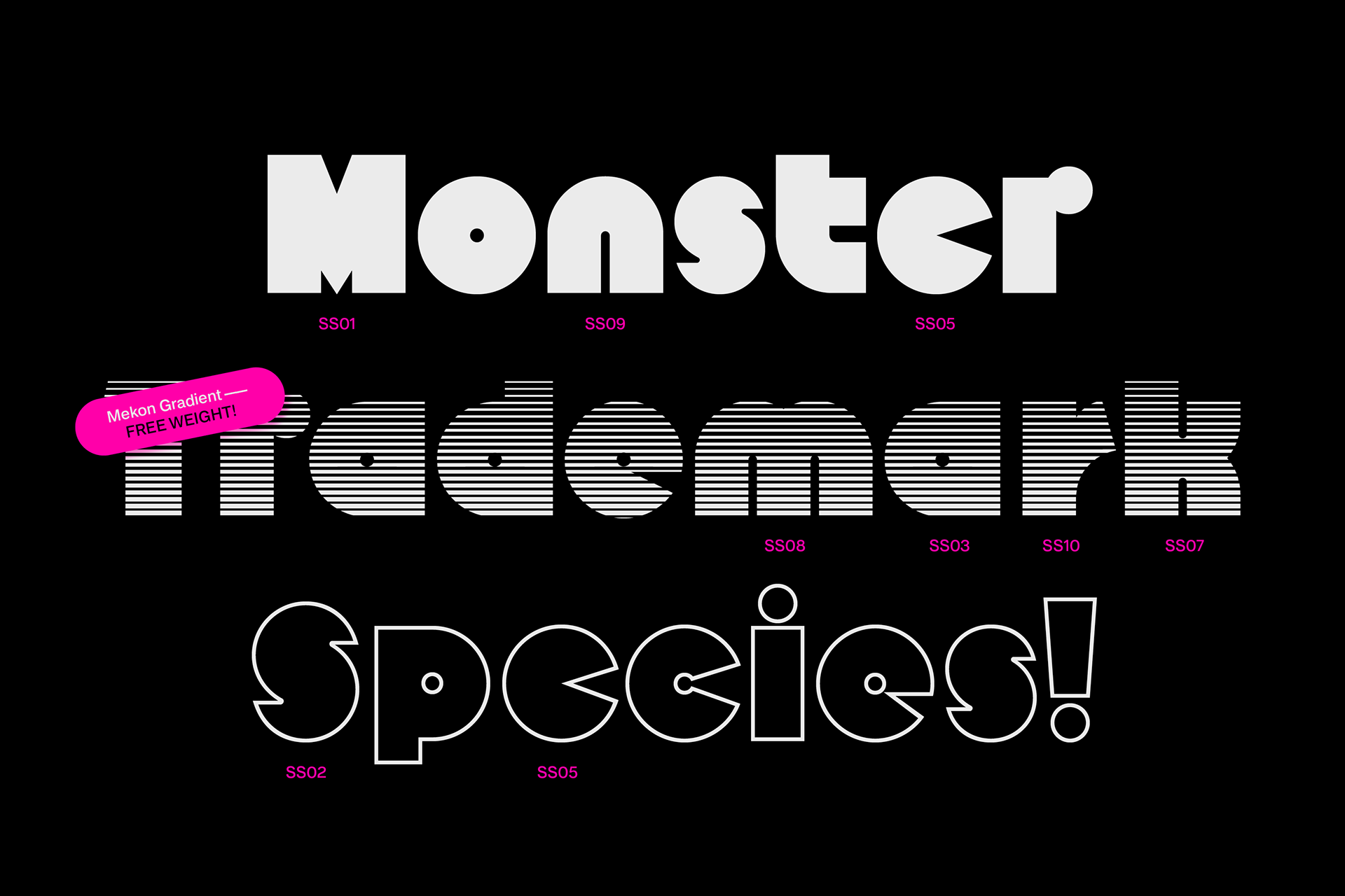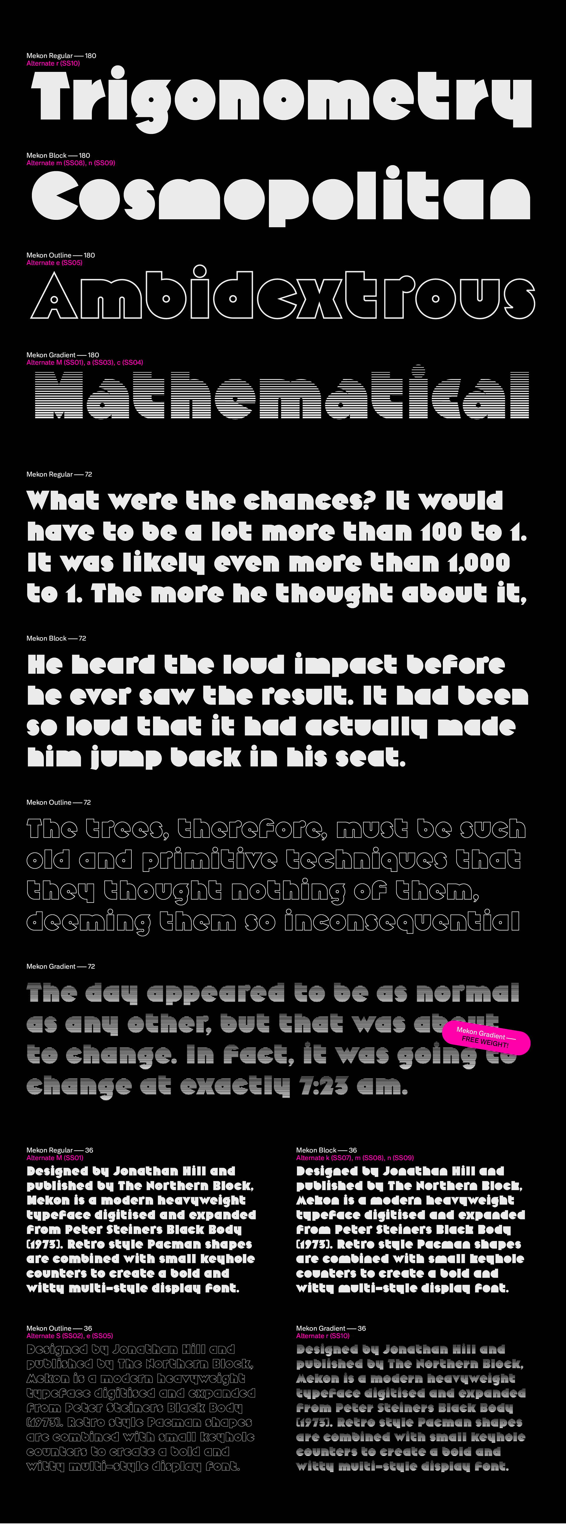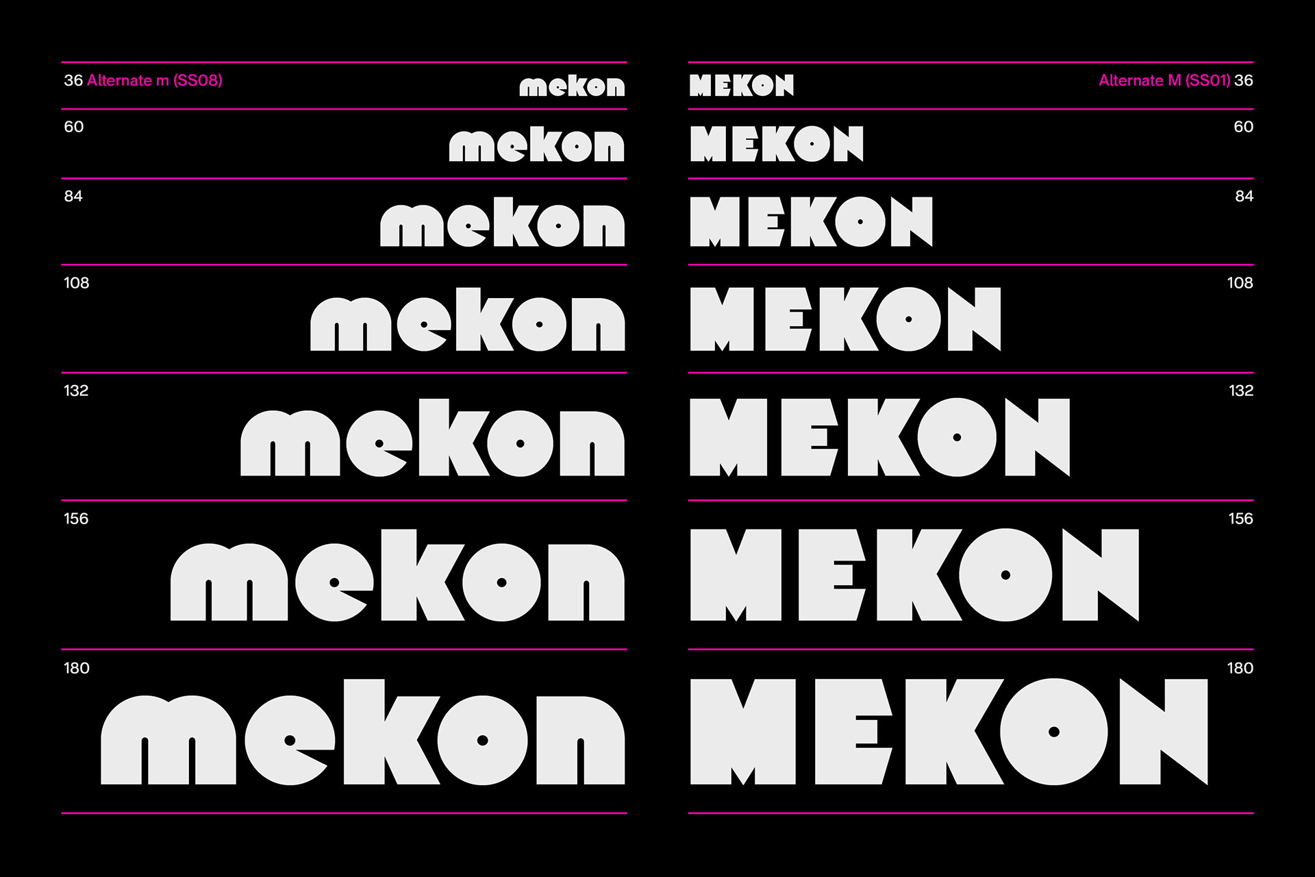 Mekon is a modern heavyweight typeface digitised and expanded from Peter Steiners Black Body (1973). Retro-style Pacman shapes are combined with small keyhole counters to create a bold and witty font ideal for apparel, books, t-shirts and posters.
