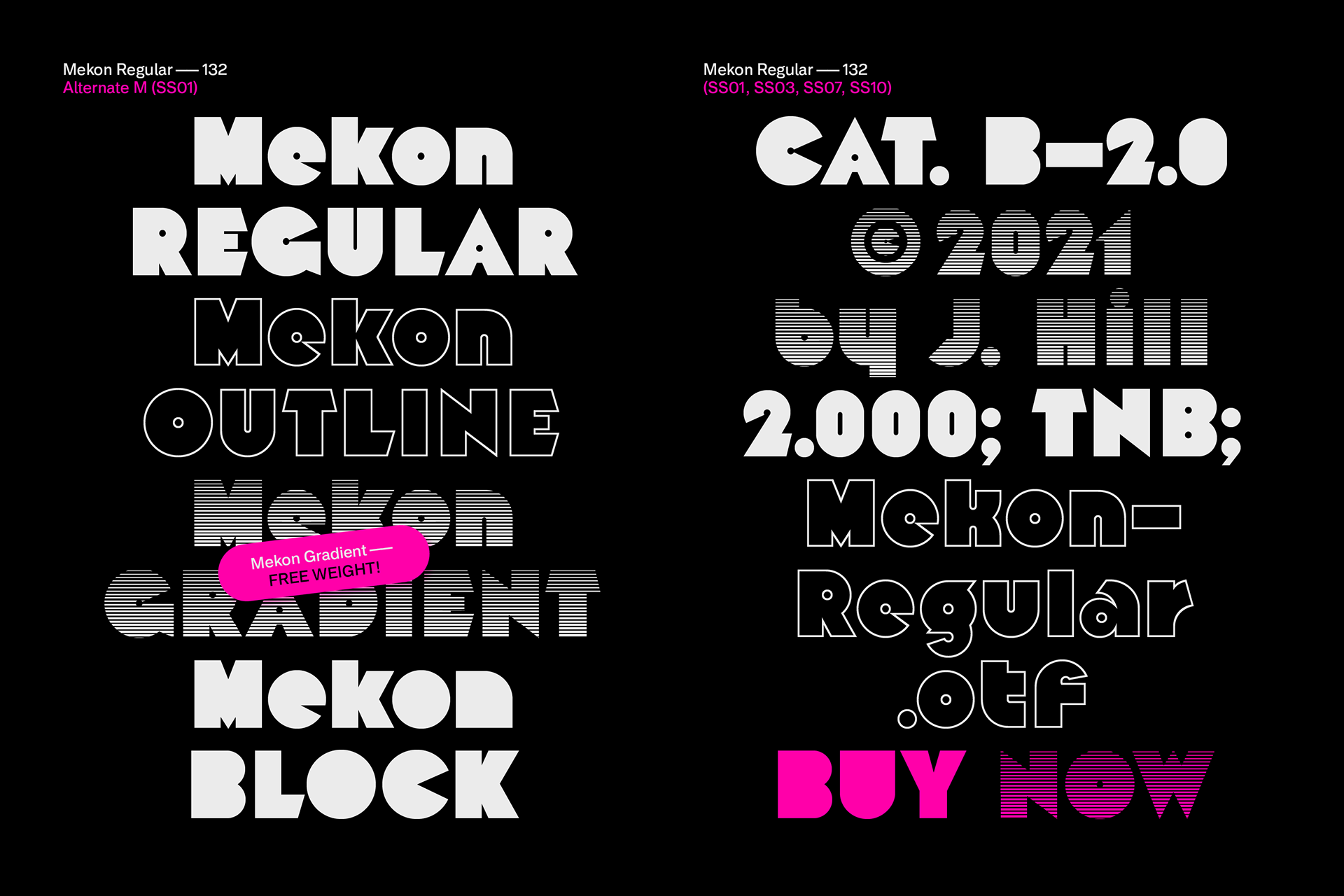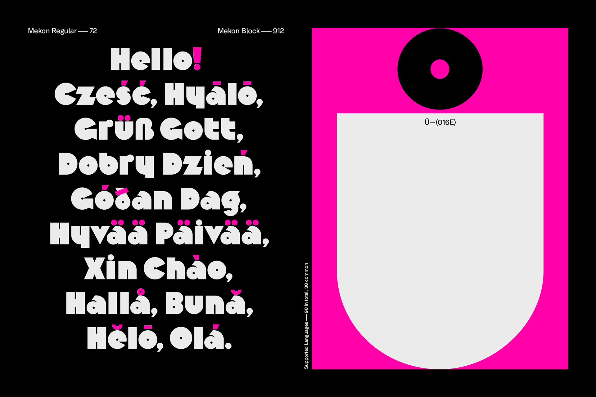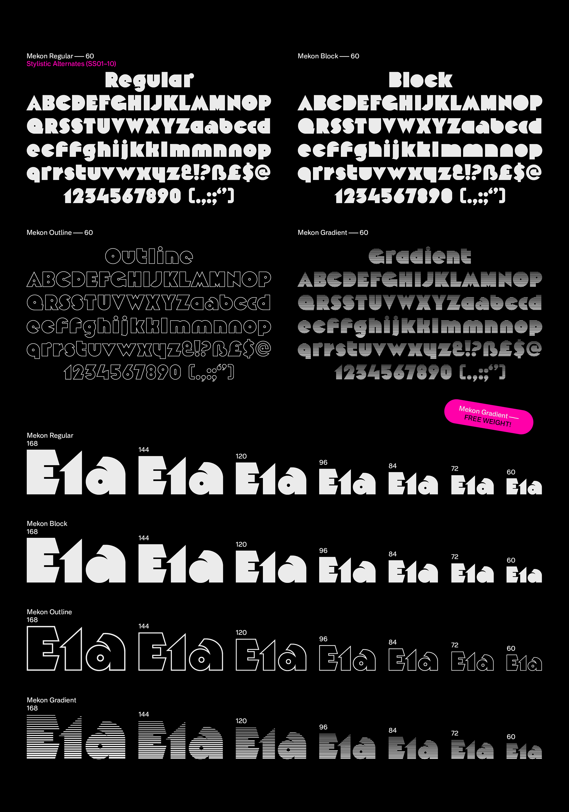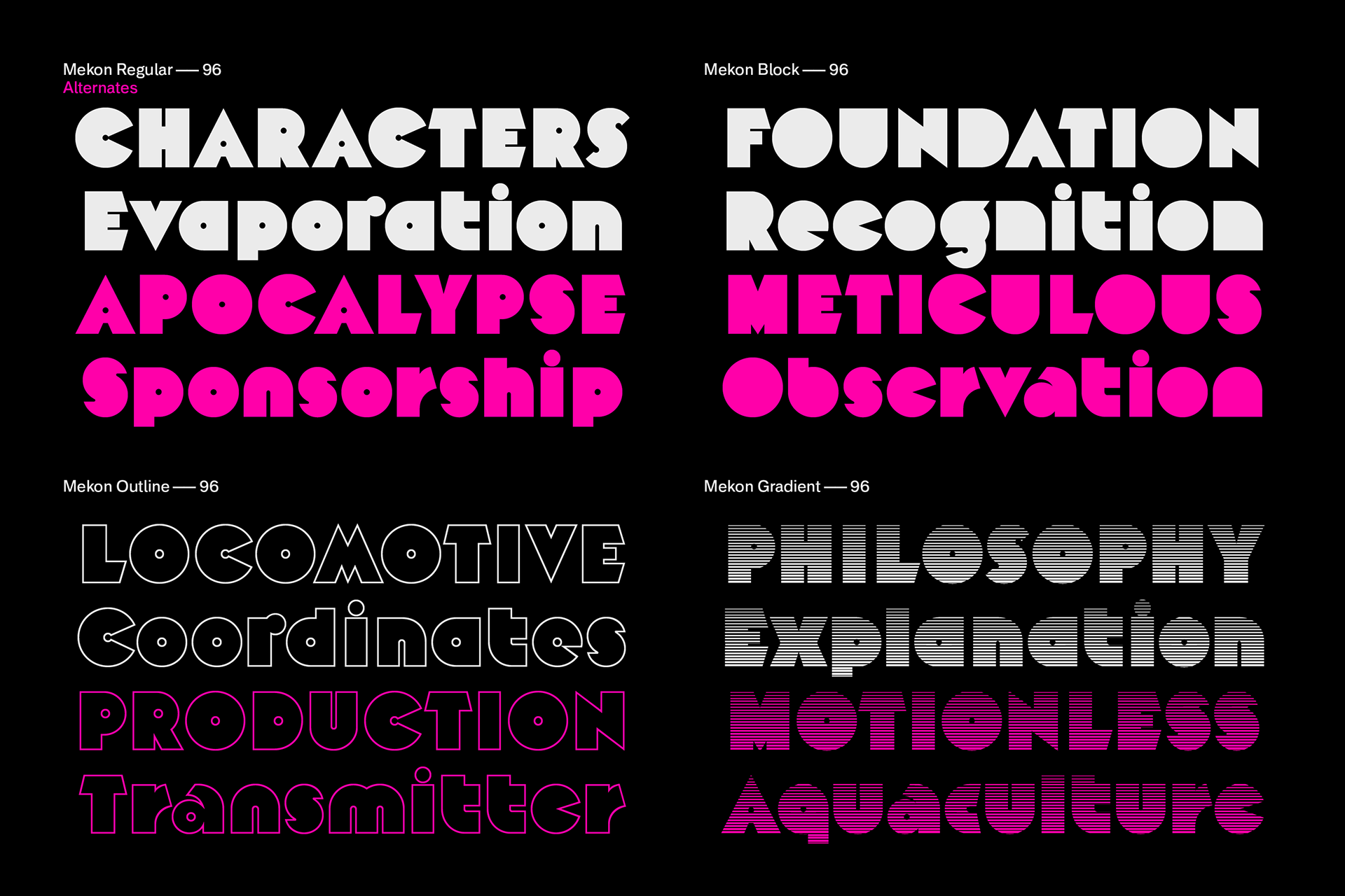 Mekon is a modern heavyweight typeface digitised and expanded from Peter Steiners Black Body (1973). Retro-style Pacman shapes are combined with small keyhole counters to create a bold and witty font ideal for apparel, books, t-shirts and posters.
