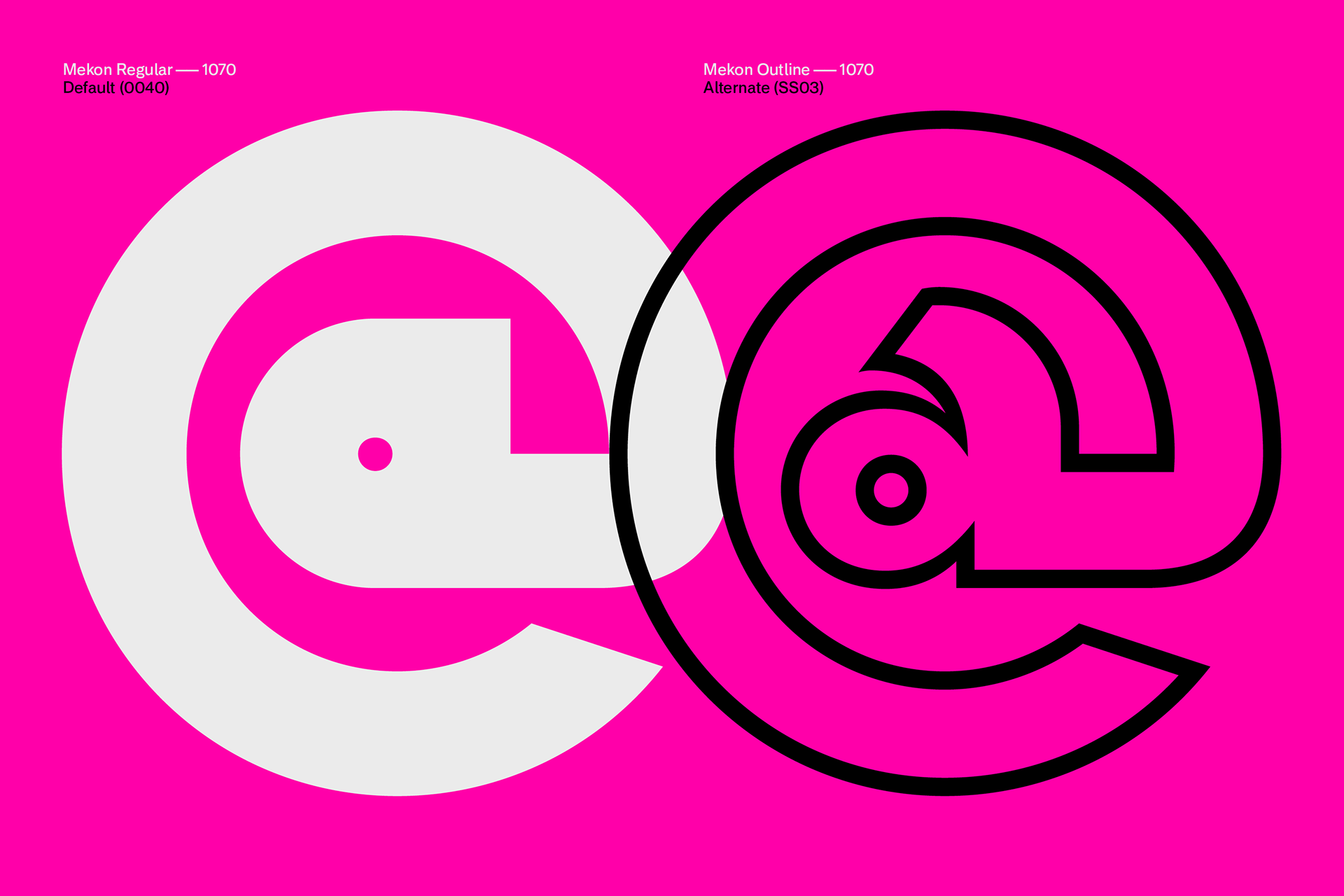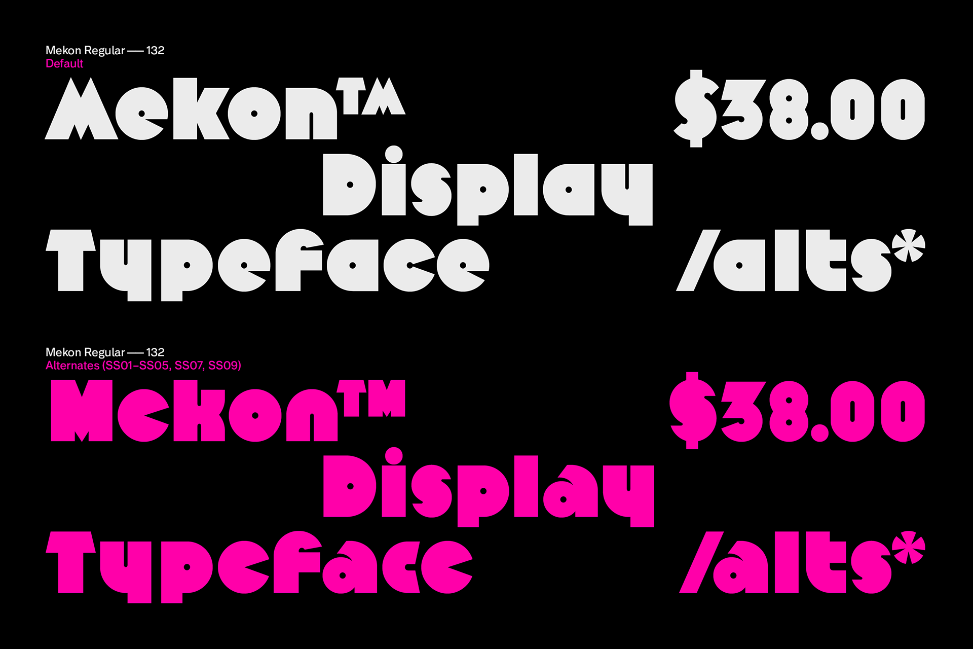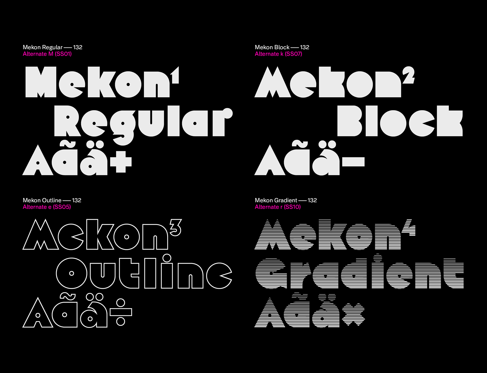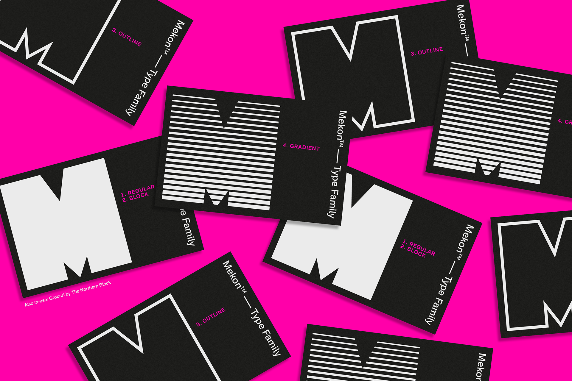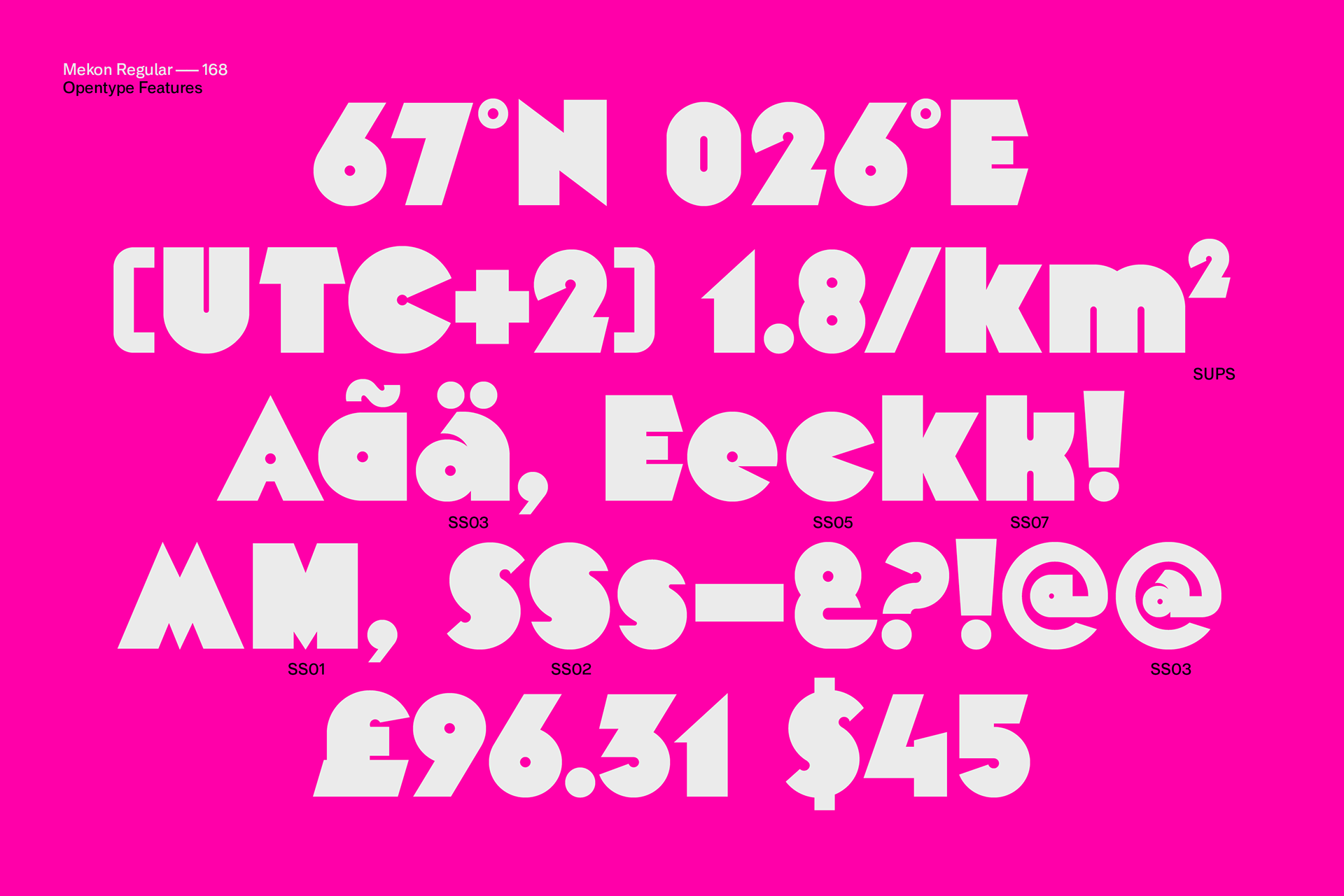 Mekon is a modern heavyweight typeface digitised and expanded from Peter Steiners Black Body (1973). Retro-style Pacman shapes are combined with small keyhole counters to create a bold and witty font ideal for apparel, books, t-shirts and posters.