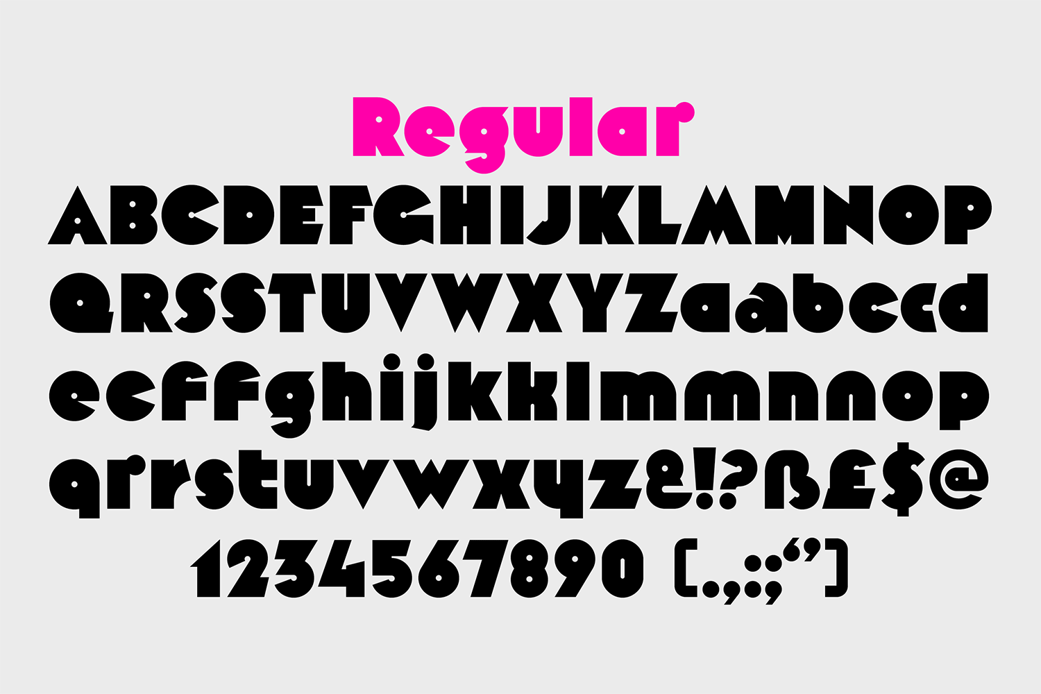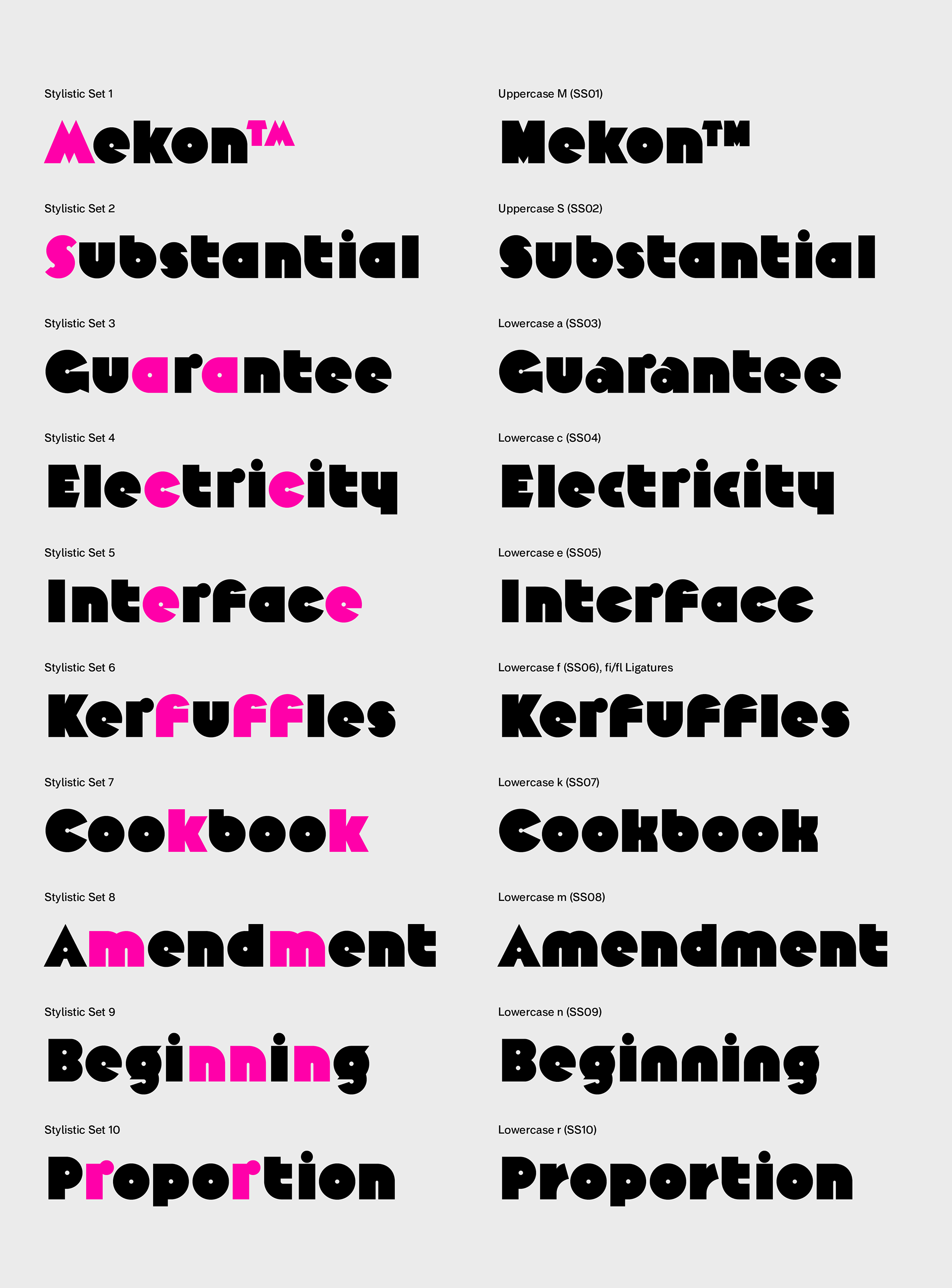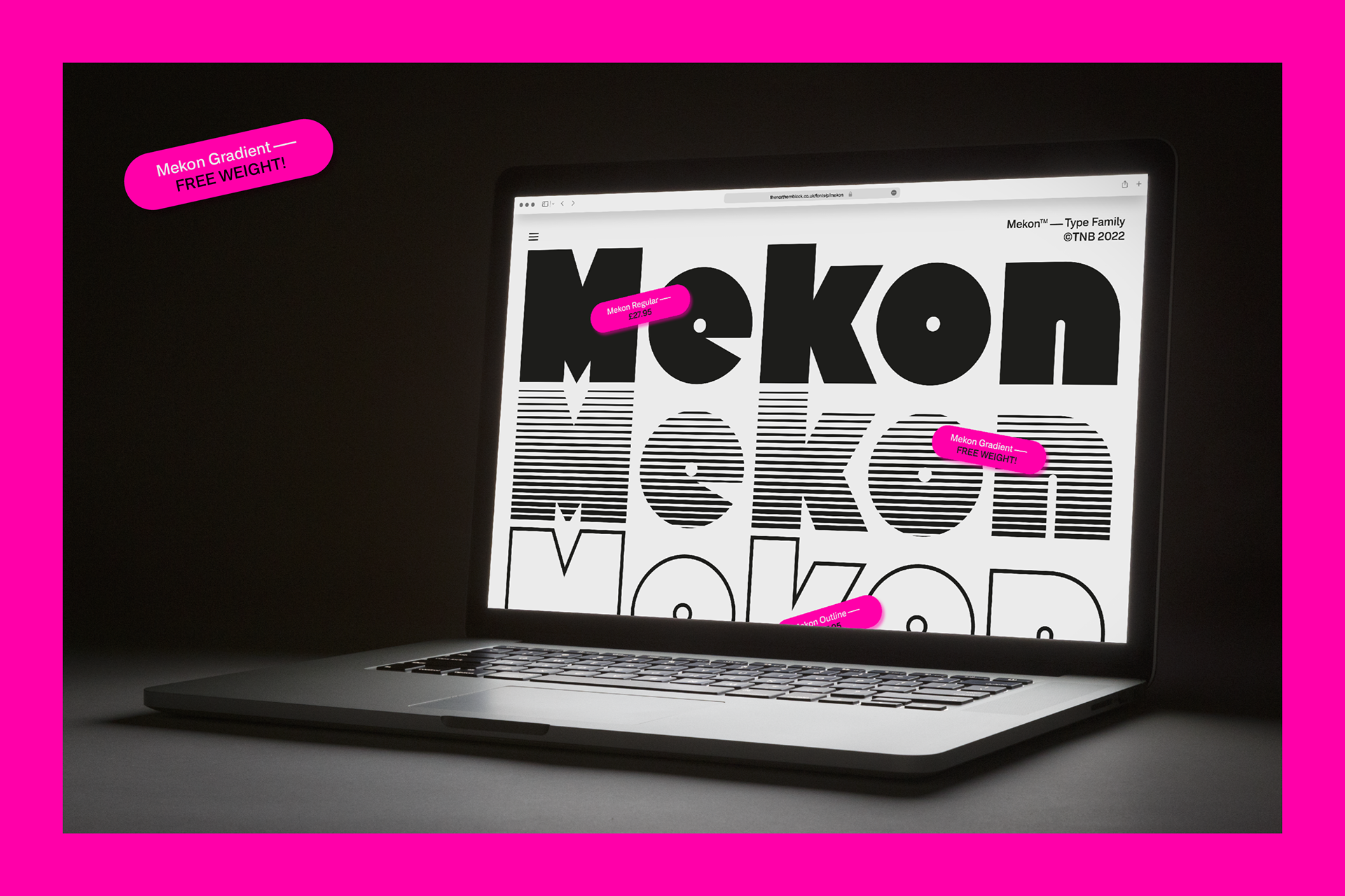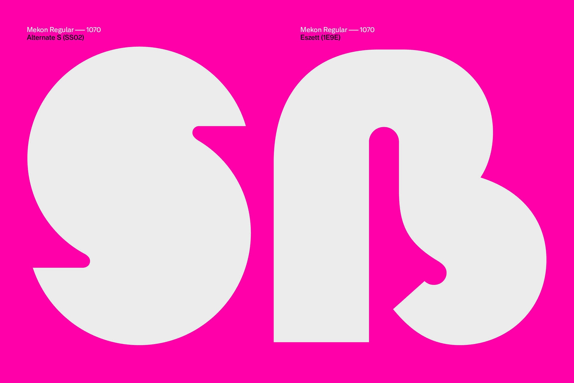 Mekon is a modern heavyweight typeface digitised and expanded from Peter Steiners Black Body (1973). Retro-style Pacman shapes are combined with small keyhole counters to create a bold and witty font ideal for apparel, books, t-shirts and posters.