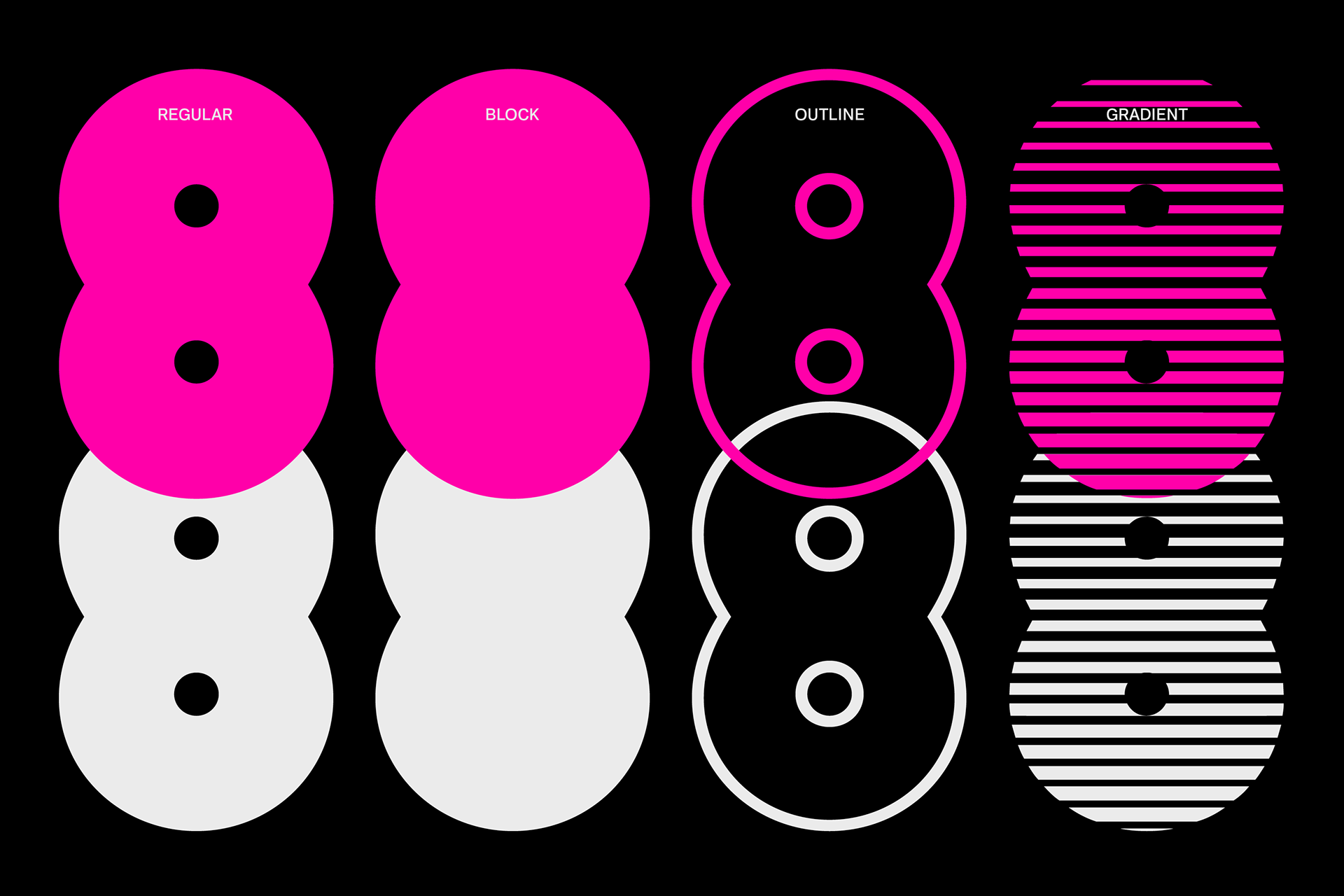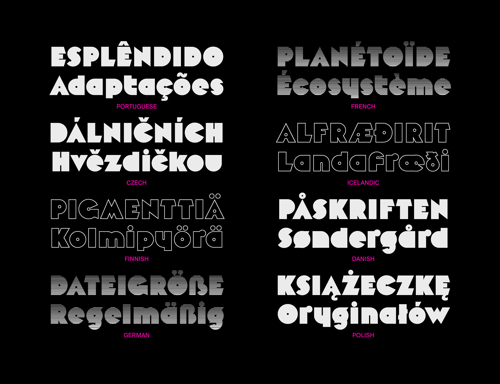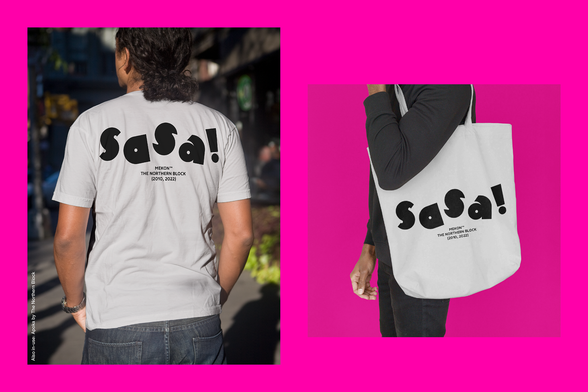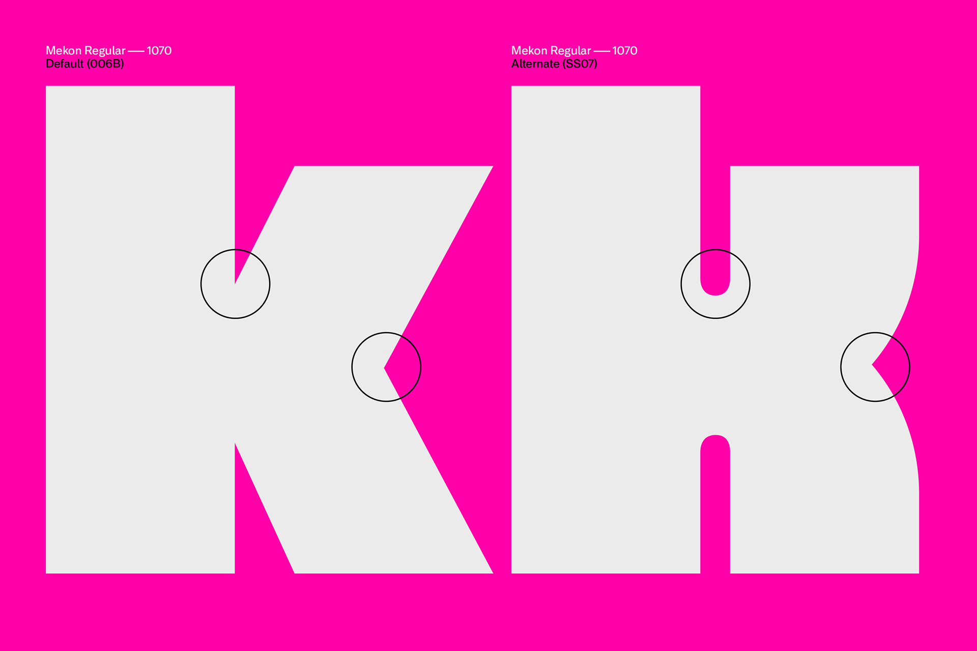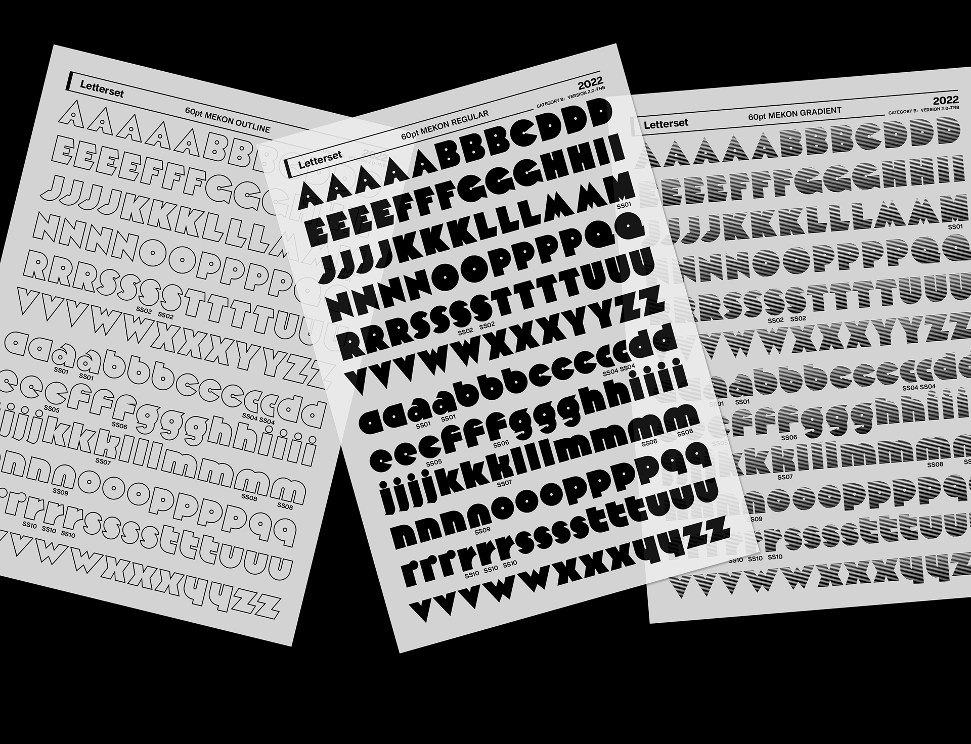 Mekon is a modern heavyweight typeface digitised and expanded from Peter Steiners Black Body (1973). Retro-style Pacman shapes are combined with small keyhole counters to create a bold and witty font ideal for apparel, books, t-shirts and posters.