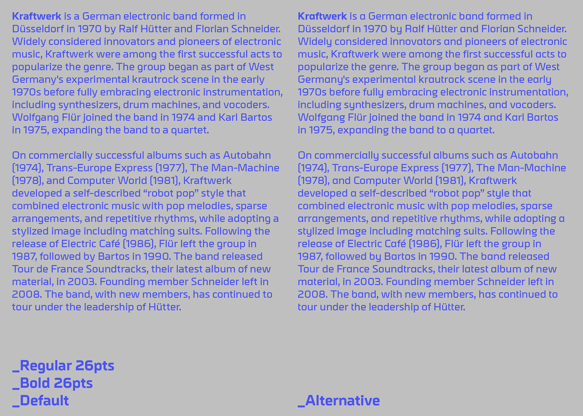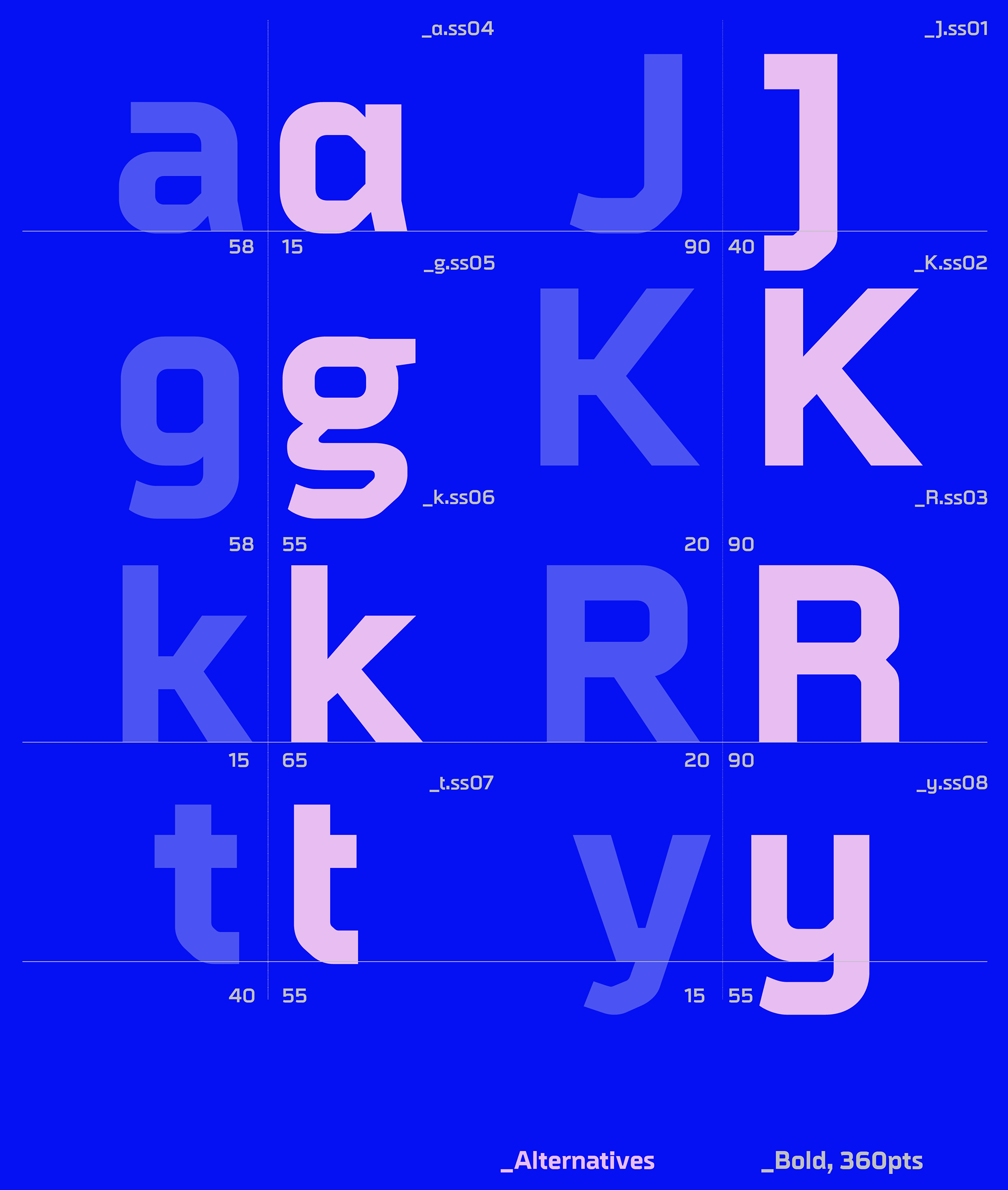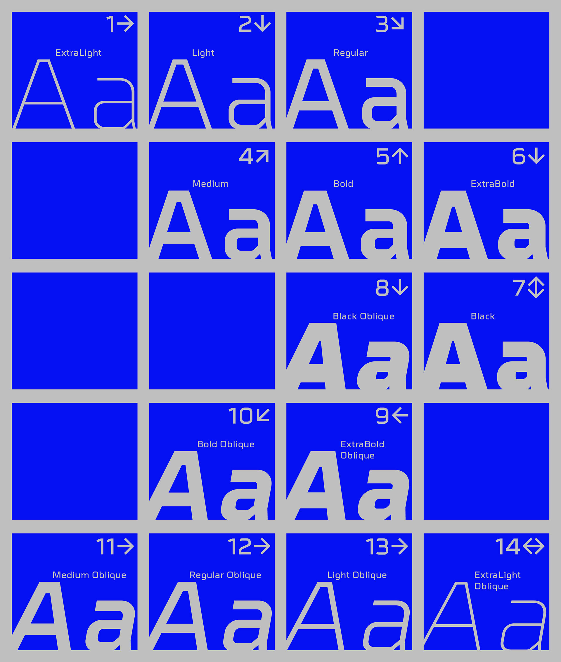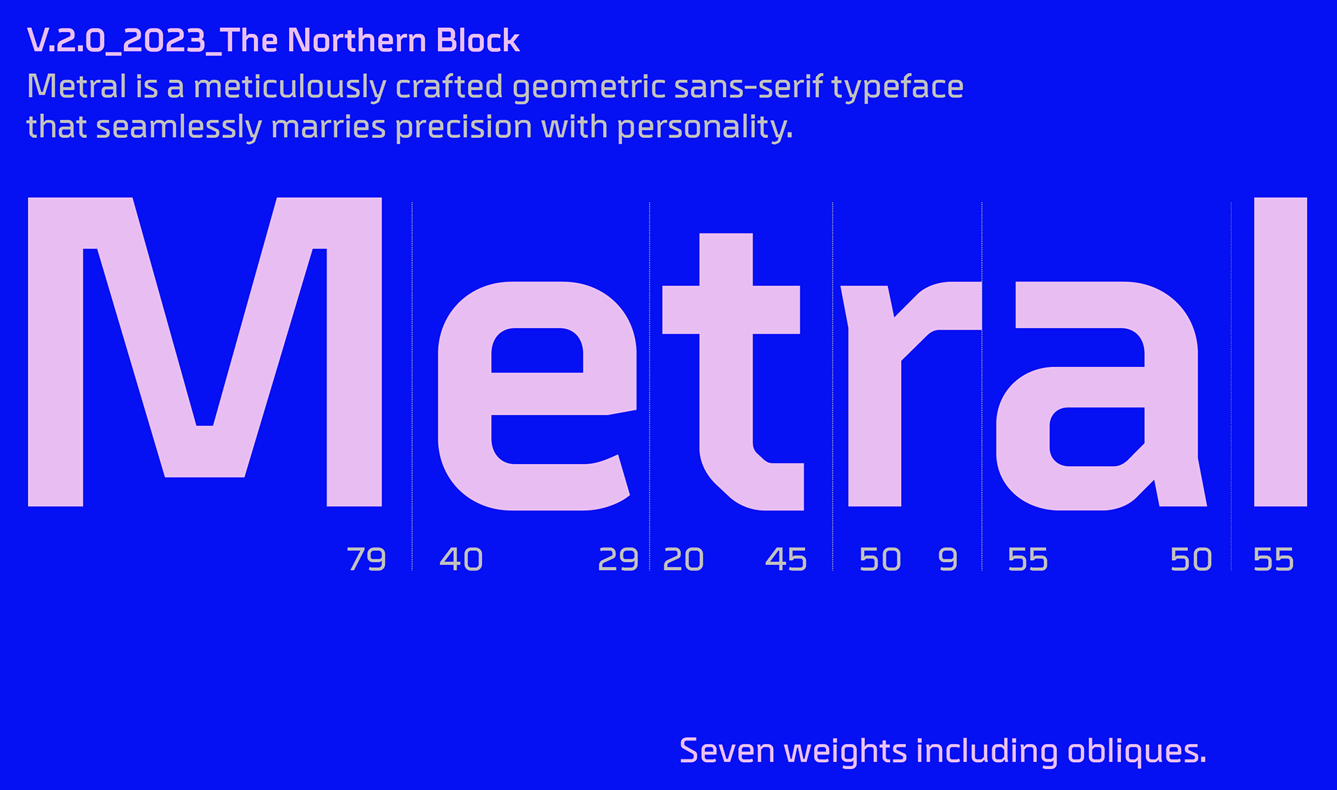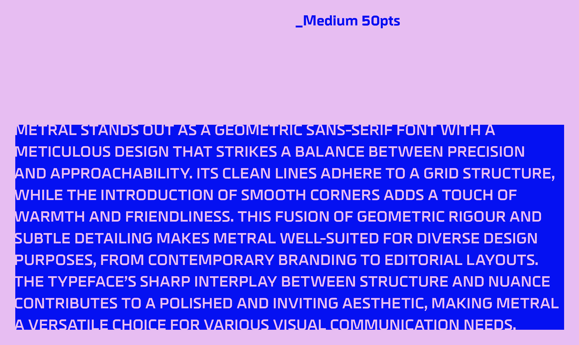 Metral stands out as a geometric sans-serif font with a meticulous design that strikes a balance between precision and approachability. Its clean lines adhere to a grid structure, while the introduction of smooth corners adds a touch of warmth and friendliness. This fusion of geometric rigor and subtle detailing makes Metral well-suited for diverse design purposes, from contemporary branding to editorial layouts. The typeface's sharp interplay between structure and nuance contributes to both a polished and inviting aesthetic, making Metral a versatile choice for a variety of visual communication needs. Details include seven weights with obliques and over 650 characters per style. OpenType features consist of digital numerals, numerators, denominators, tabular, fractions, alternative J, K, R, a, k, g, t, y, and language support covering Western, Southern and Central Europe—remastered to version 2.0 for enhanced OpenType features and usability.