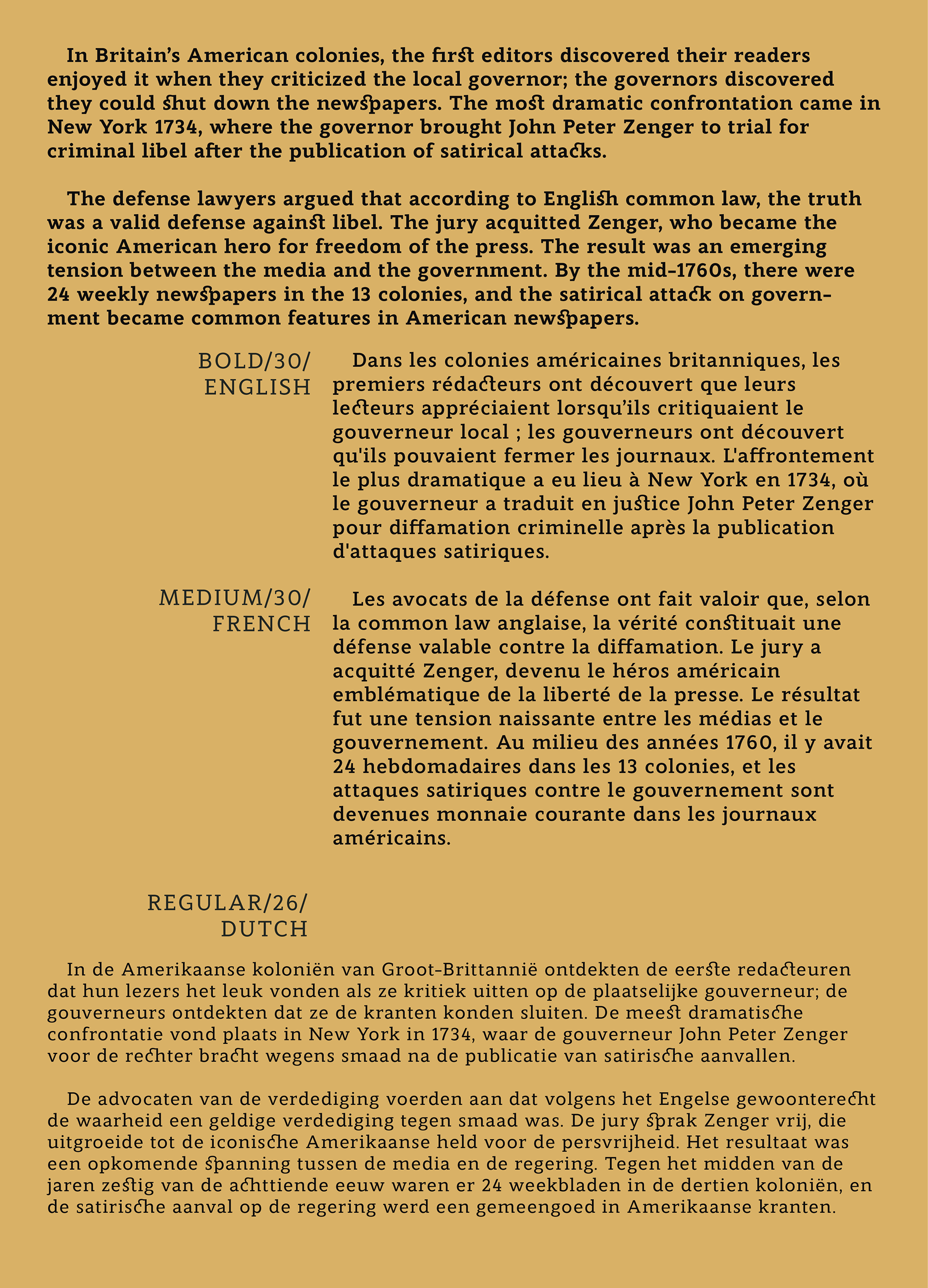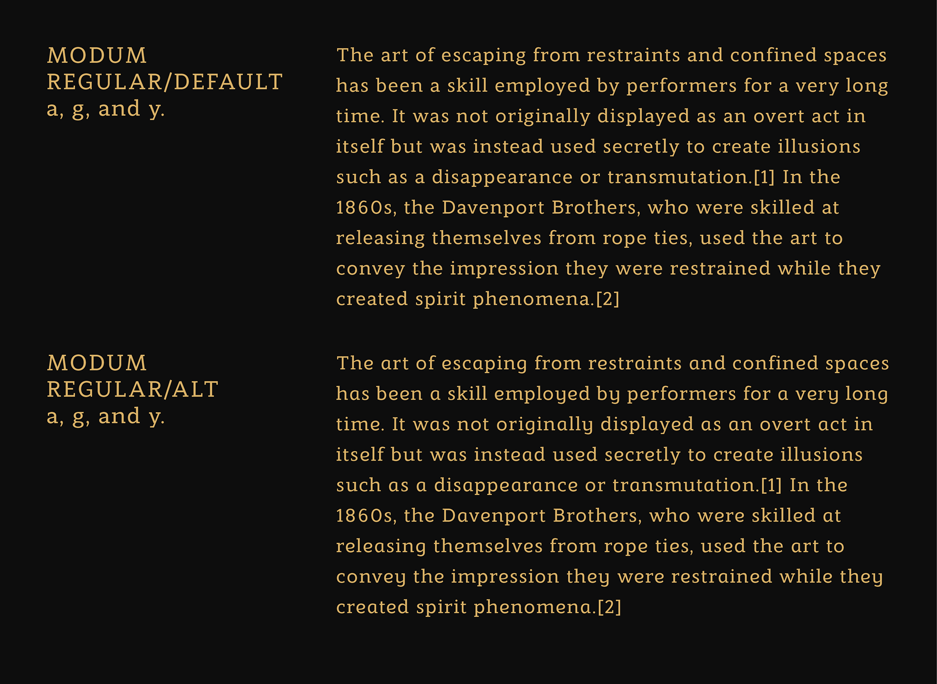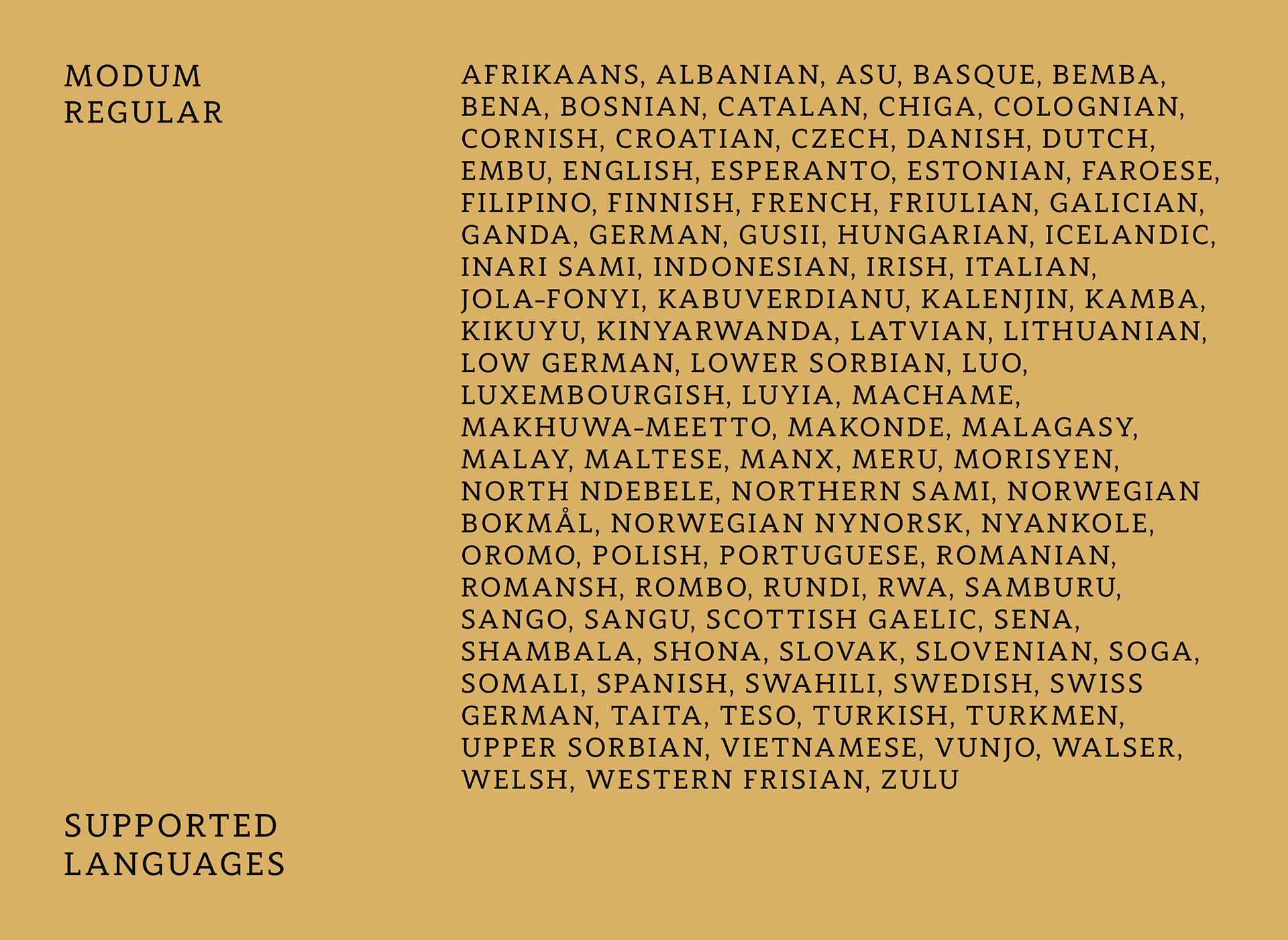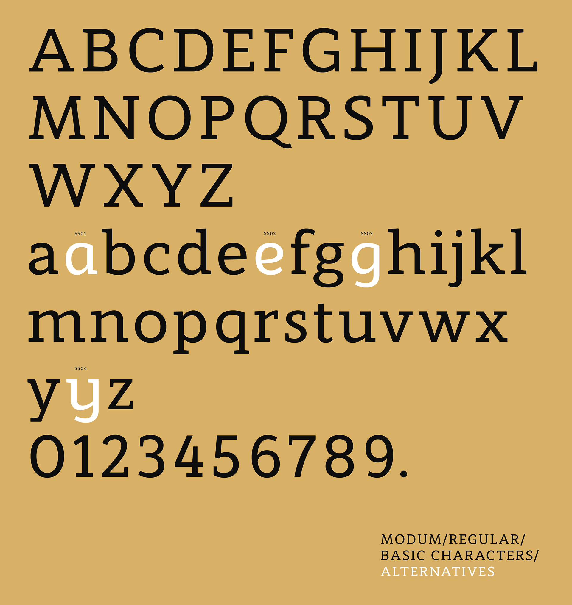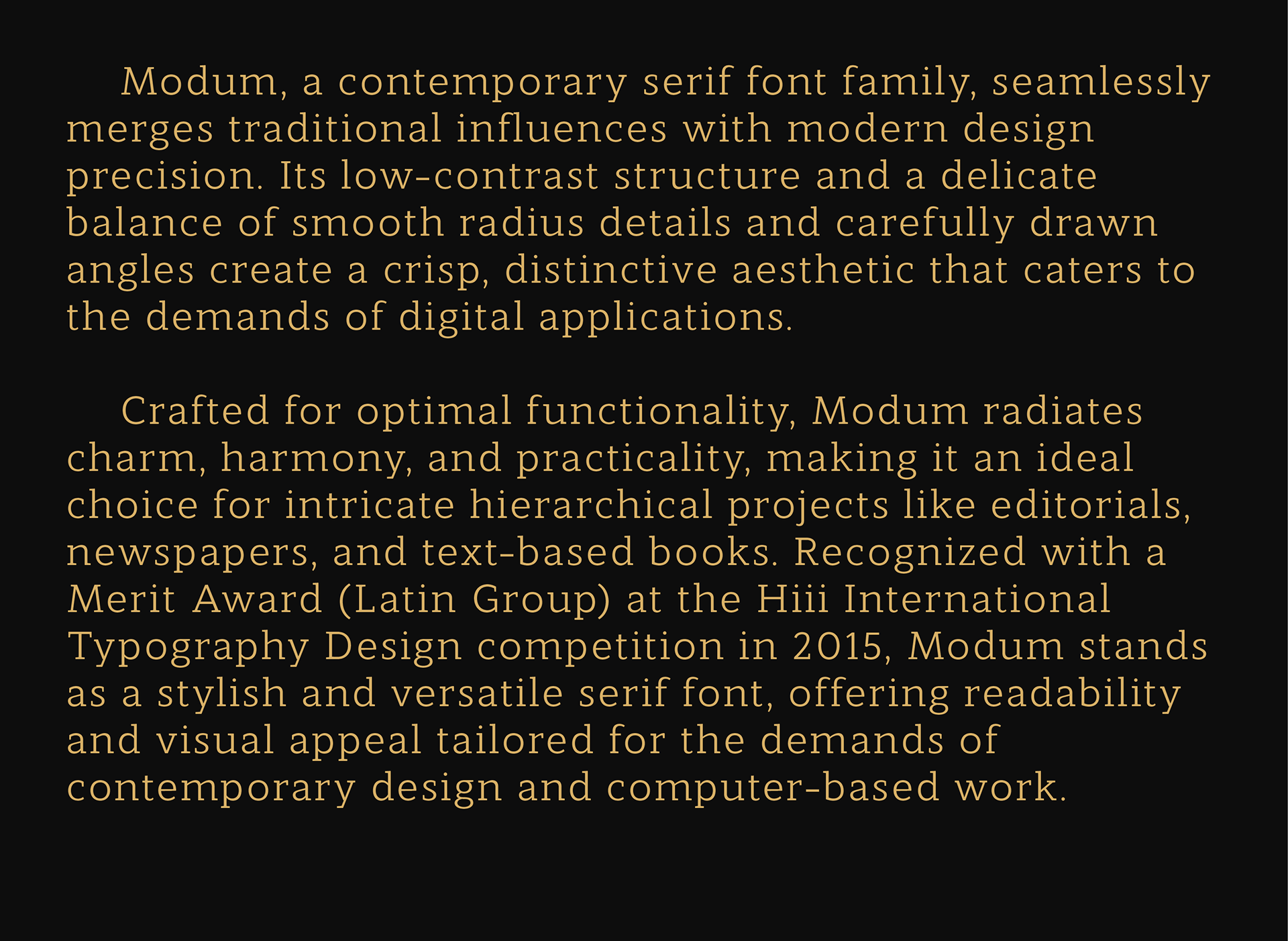 Modum, a contemporary serif font family, seamlessly merges traditional influences with modern design precision. Its low-contrast structure and a delicate balance of smooth radius details and carefully drawn angles create a crisp, distinctive aesthetic that caters to the demands of digital applications. Crafted for optimal functionality, Modum radiates charm, harmony, and practicality, making it an ideal choice for intricate hierarchical projects like editorials, newspapers, and text-based books. Recognized with a Merit Award (Latin Group) at the Hiii International Typography Design competition in 2015, Modum stands as a stylish and versatile serif font, offering readability and visual appeal tailored for the demands of contemporary design and computer-based work. Modum has undergone a significant upgrade to version 2.0, introducing enhancements that elevate its typographic capabilities.