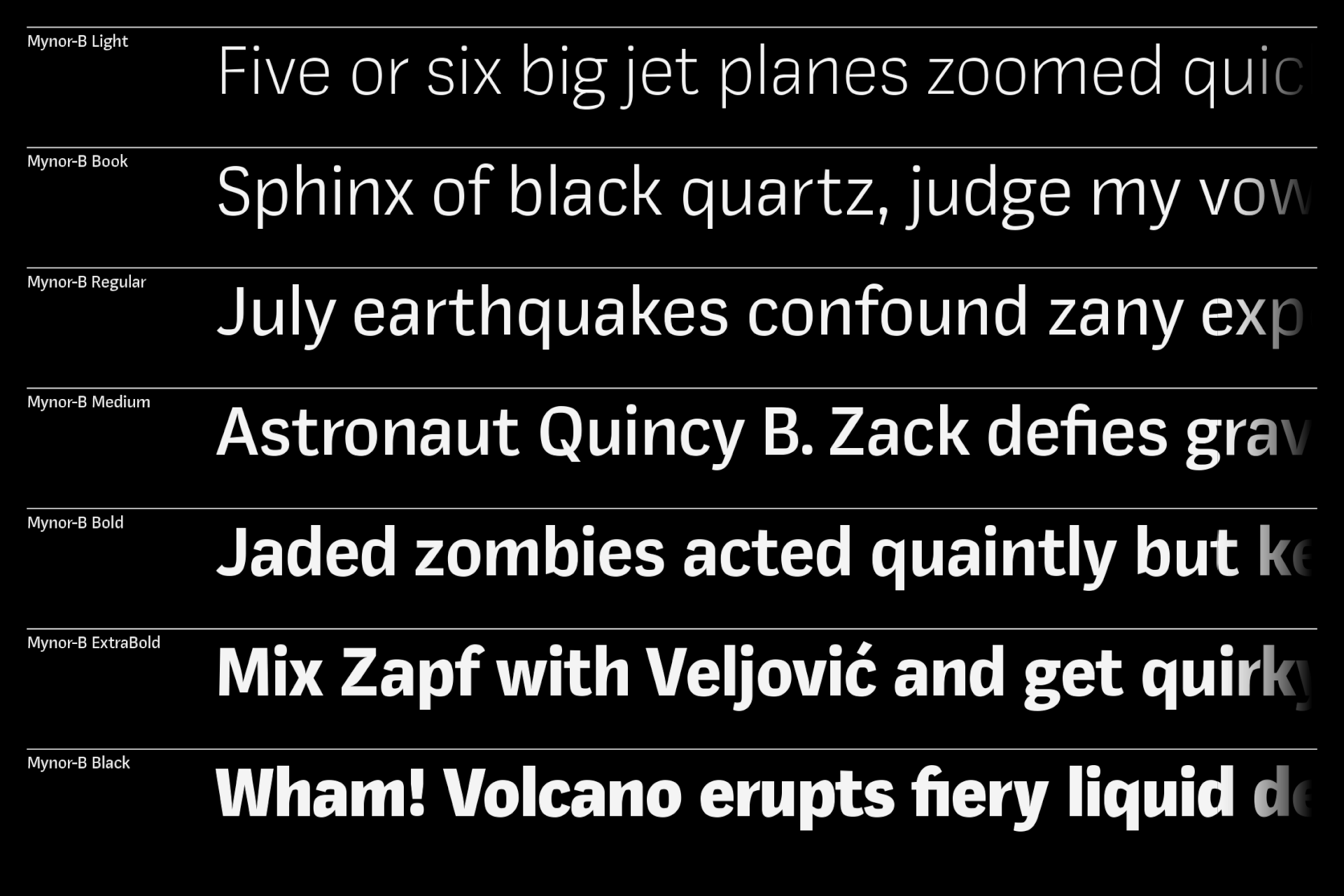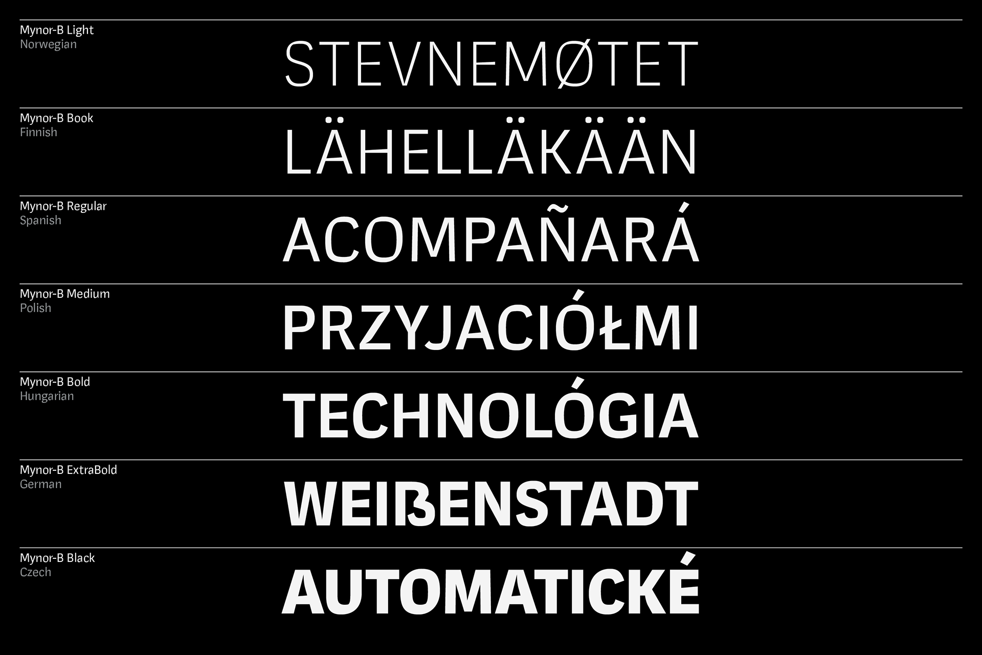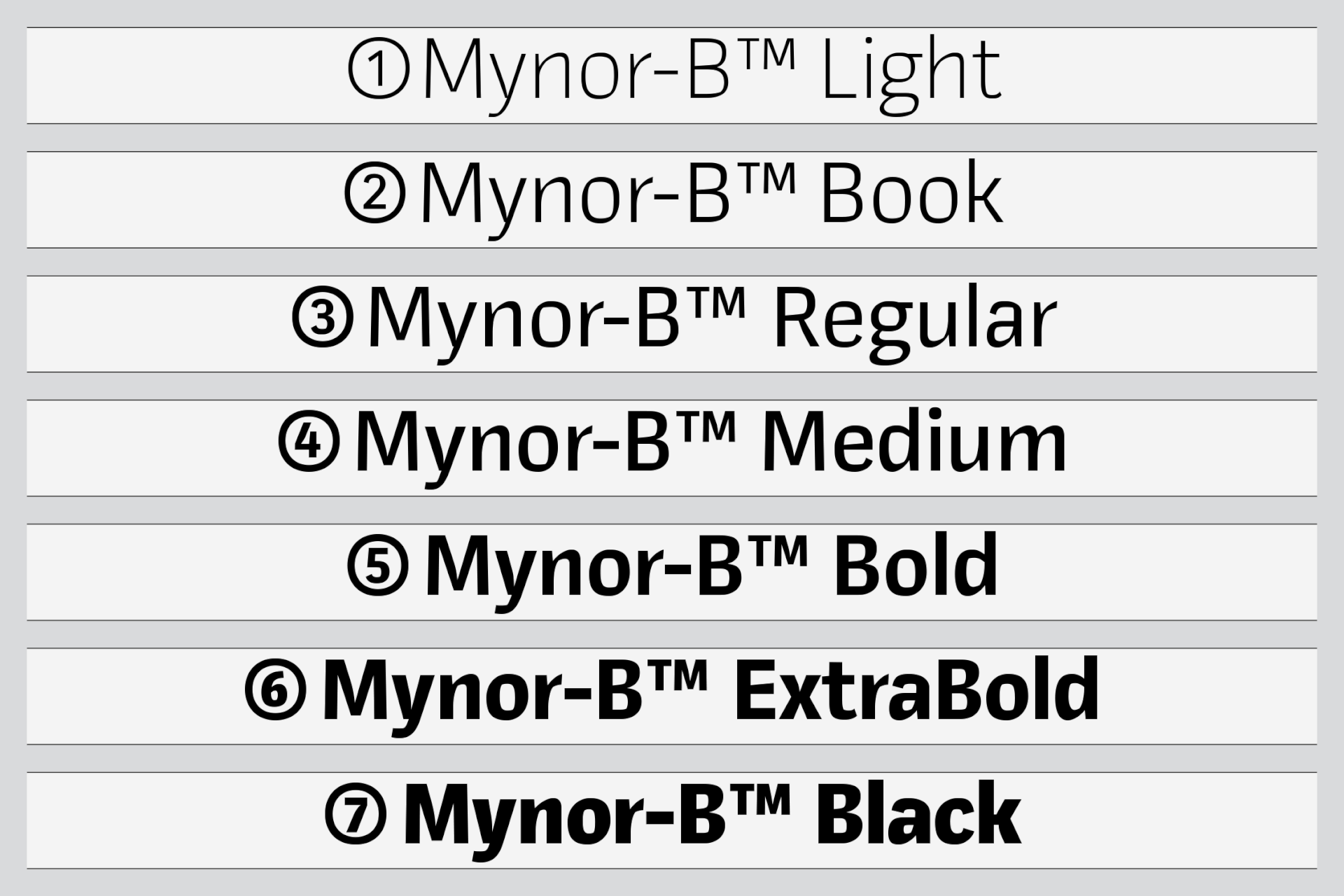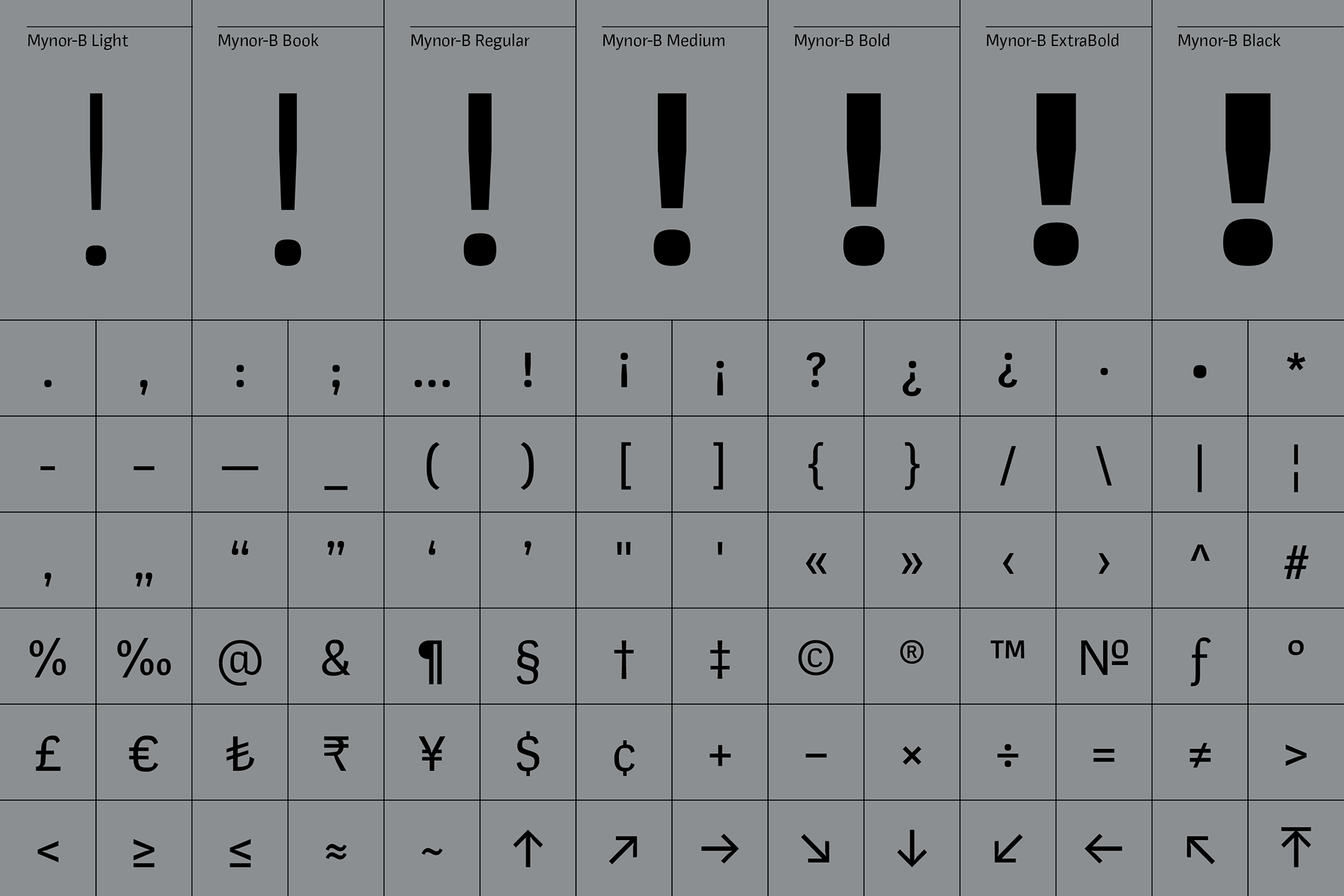Mynor-B departs from its predecessor, Mynor, which had a squarish geometric design. The shift aims to make the typeface more humanist, expressive, and readable, especially in longer texts. Inspired by Kintsugi, Mynor-B introduces organic forms and expressive elements, creating a dynamic visual experience. This change adds a human touch and improves legibility for extended reading. Essentially, Mynor-B balances a more humanistic and expressive design, making it versatile for various applications while acknowledging its origin in Mynor's geometric style. The font includes seven weights and obliques, with over 950 characters per style. It boasts fourteen number variations, alternate lowercase characters (a, g, l, and y), and special glyphs like arrows. Small caps expand design options for headings and captions. With extensive language support encompassing Western, Southern, and Central Europe, plus Vietnamese.