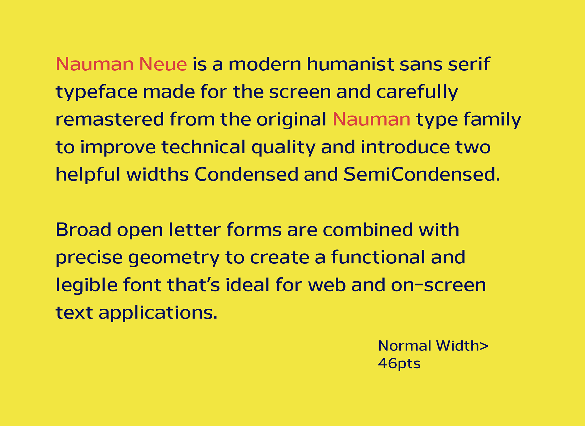 Nauman Neue is a modern humanist sans serif typeface made for the screen and carefully remastered from the original Nauman type family to improve technical quality and introduce two helpful widths condensed and semi-condensed.