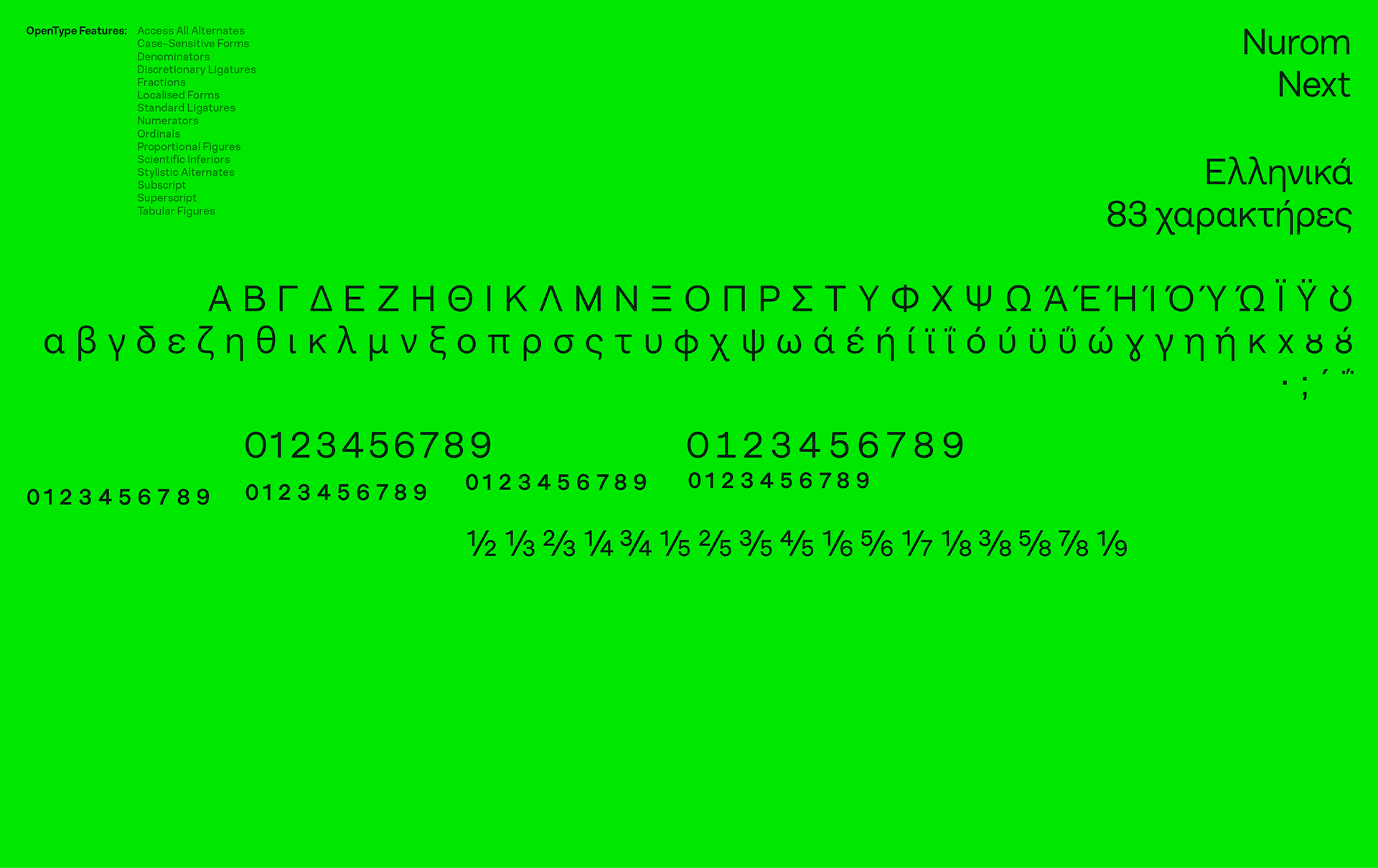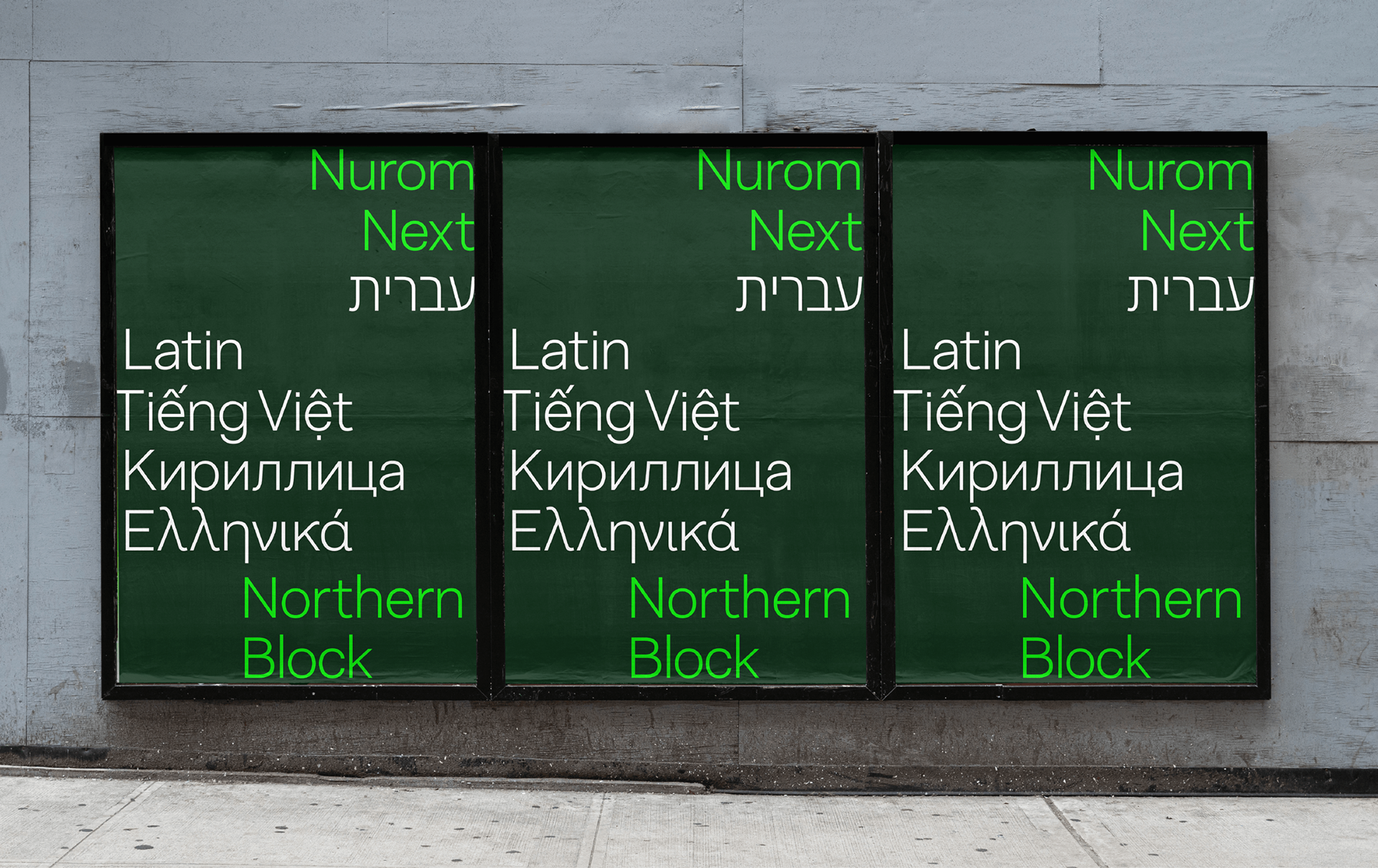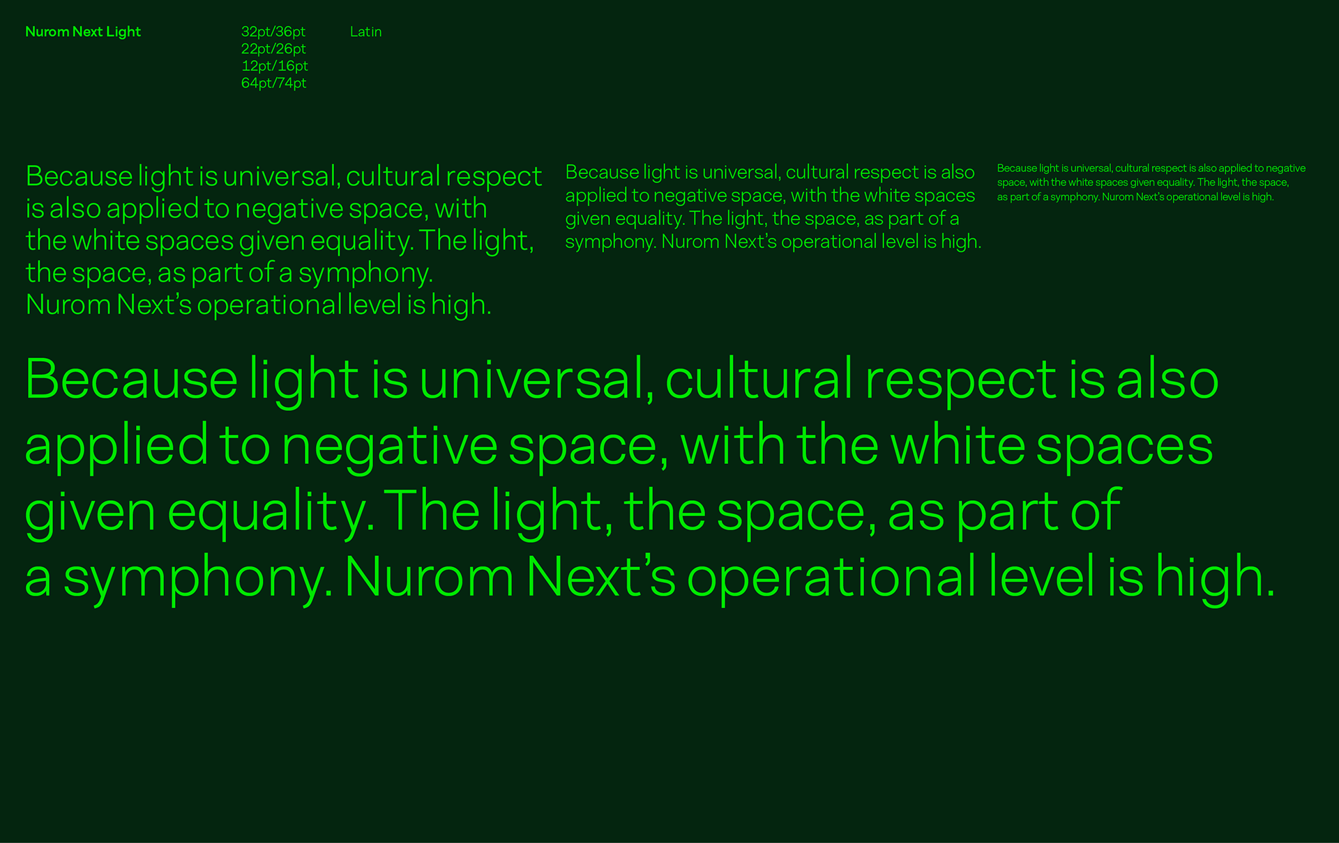 Nurom Next, the evolution of the original Nurom typeface released in 2017, represents a contemporary sans-serif design influenced by early grotesque styles. This next-generation typeface sets itself apart by avoiding a strict historical revival, opting for a fresh personality and distinct character. The design principles prioritise clean lines, balanced proportions, and a contemporary aesthetic, ensuring Nurom Next remains relevant in today's design landscape. A significant enhancement in Nurom Next is its extended language support, now accommodating Cyrillic, Greek, Hebrew, and Vietnamese. This update makes the typeface more versatile and accessible globally, catering to designers with diverse linguistic requirements. The commitment to providing this extended language support demonstrates responsiveness to the evolving needs of a multicultural and multilingual design environment. | Collaborators: Liron Lavi Turkenich, Common Ground, The Word Garden.