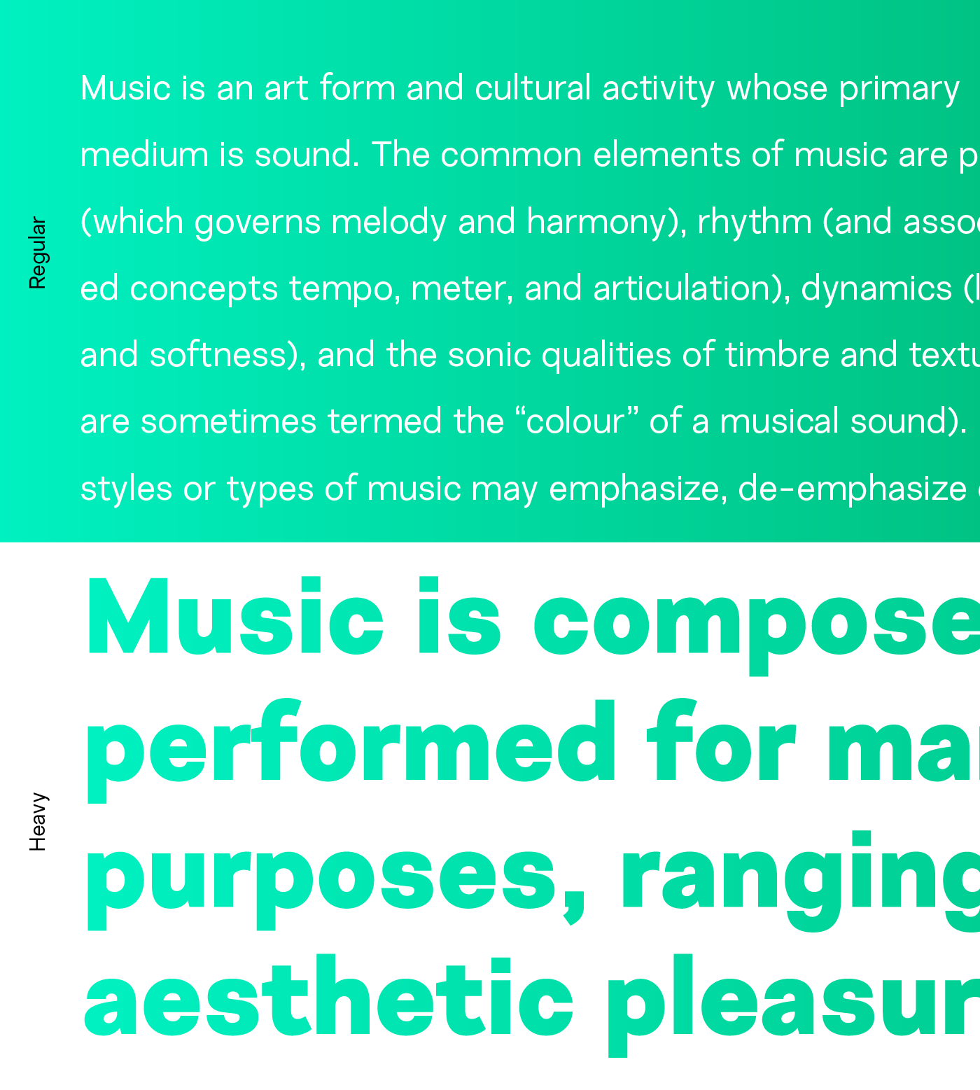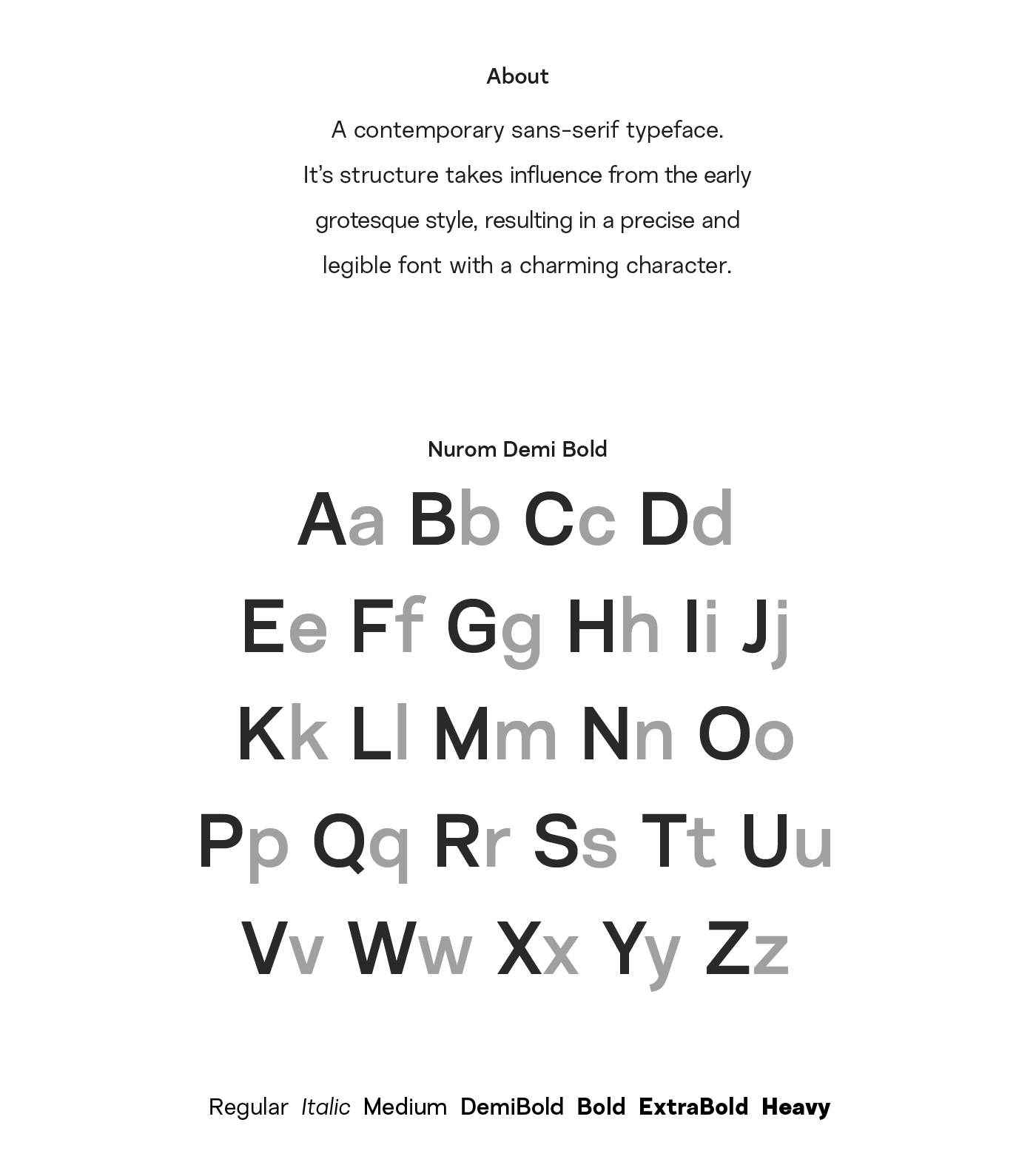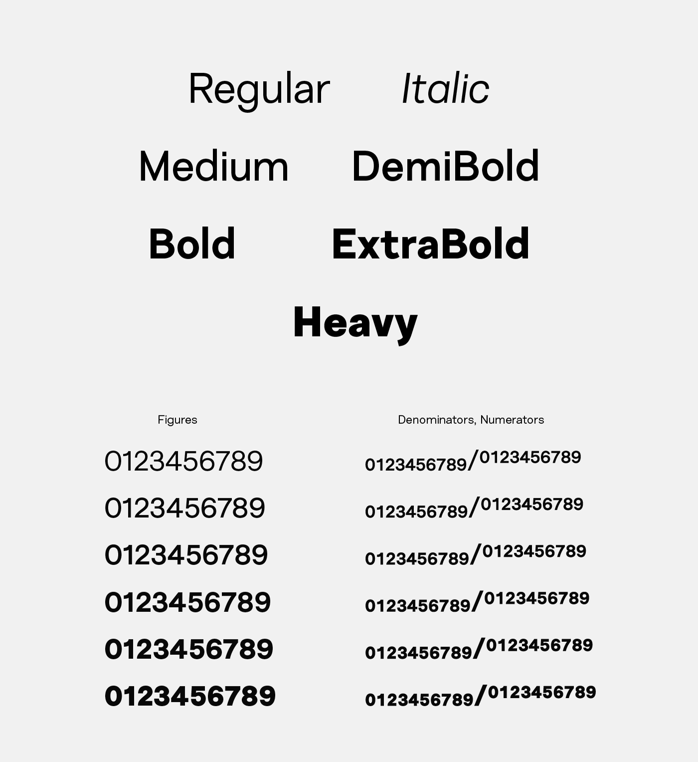 A contemporary sans-serif typeface. Its structure takes influence from the early grotesque style, resulting in a precise and legible font with a charming character. Details include seven weights, over 400 characters, manually edited kerning and Opentype features.