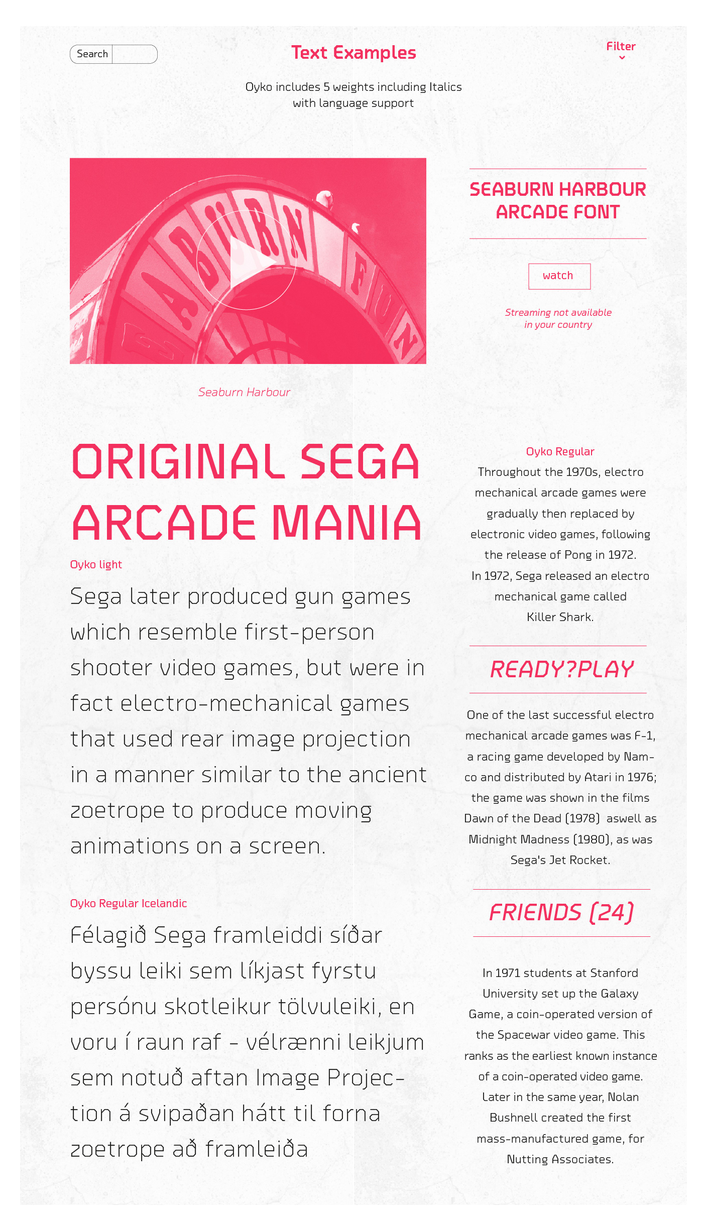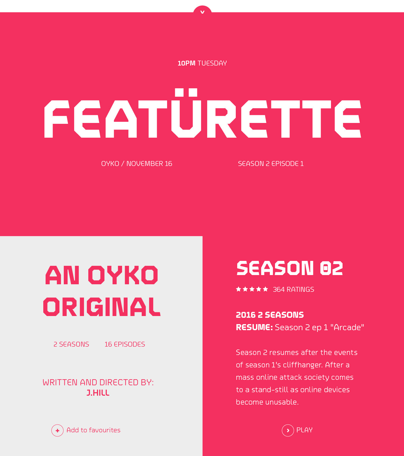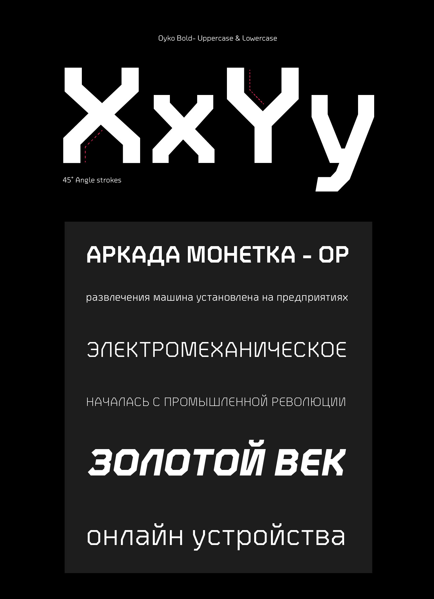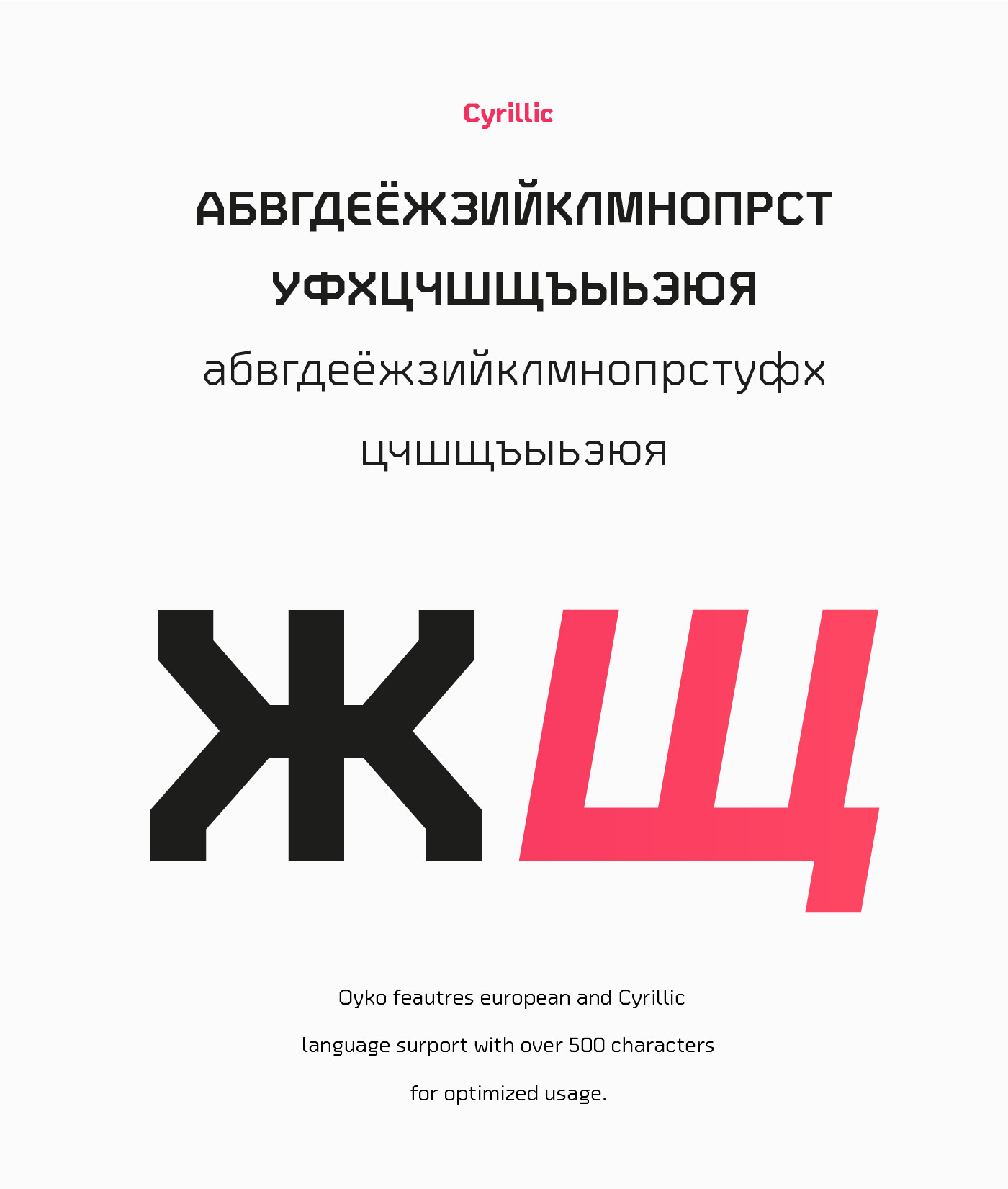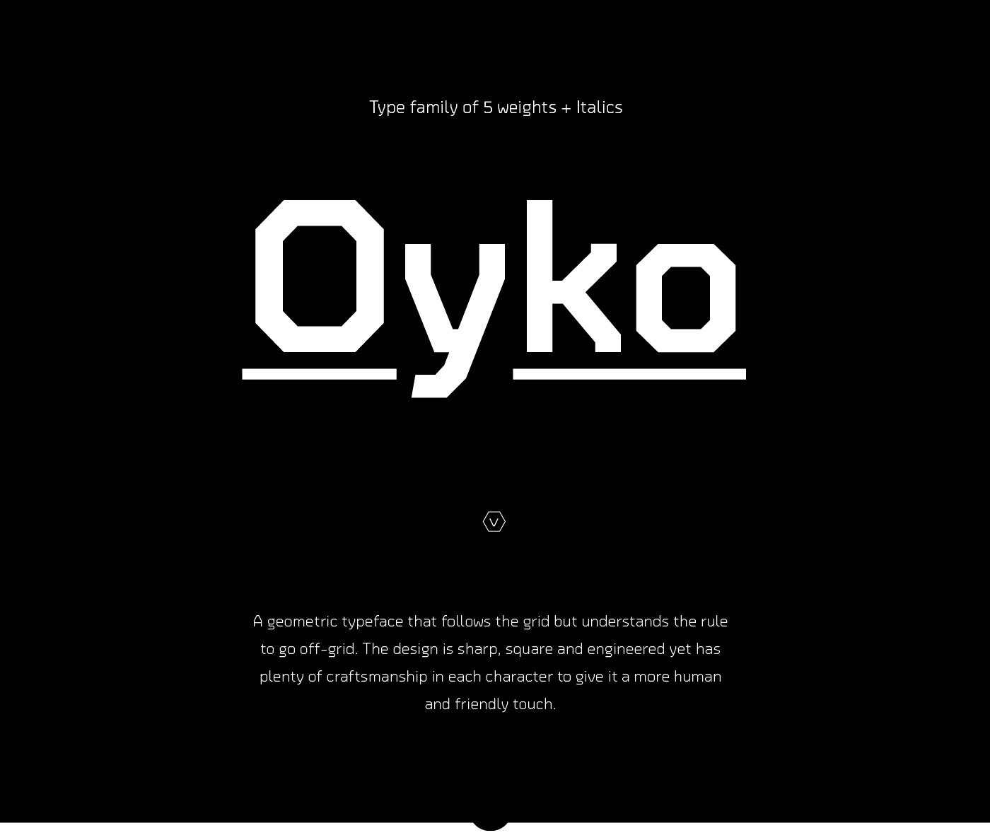 A geometric typeface that follows the grid but understands the rule to go off-grid. The design is sharp, square and engineered yet has plenty of craftsmanship in each character to give it a more human and friendly touch. Oyko is best suited to immersive interfaces, including mobile apps, video games, virtual reality and the web. Details include five purposeful weights with italics, over 500 characters, five variations of numerals, stylistic zeros, Cyrillic and OpenType features.