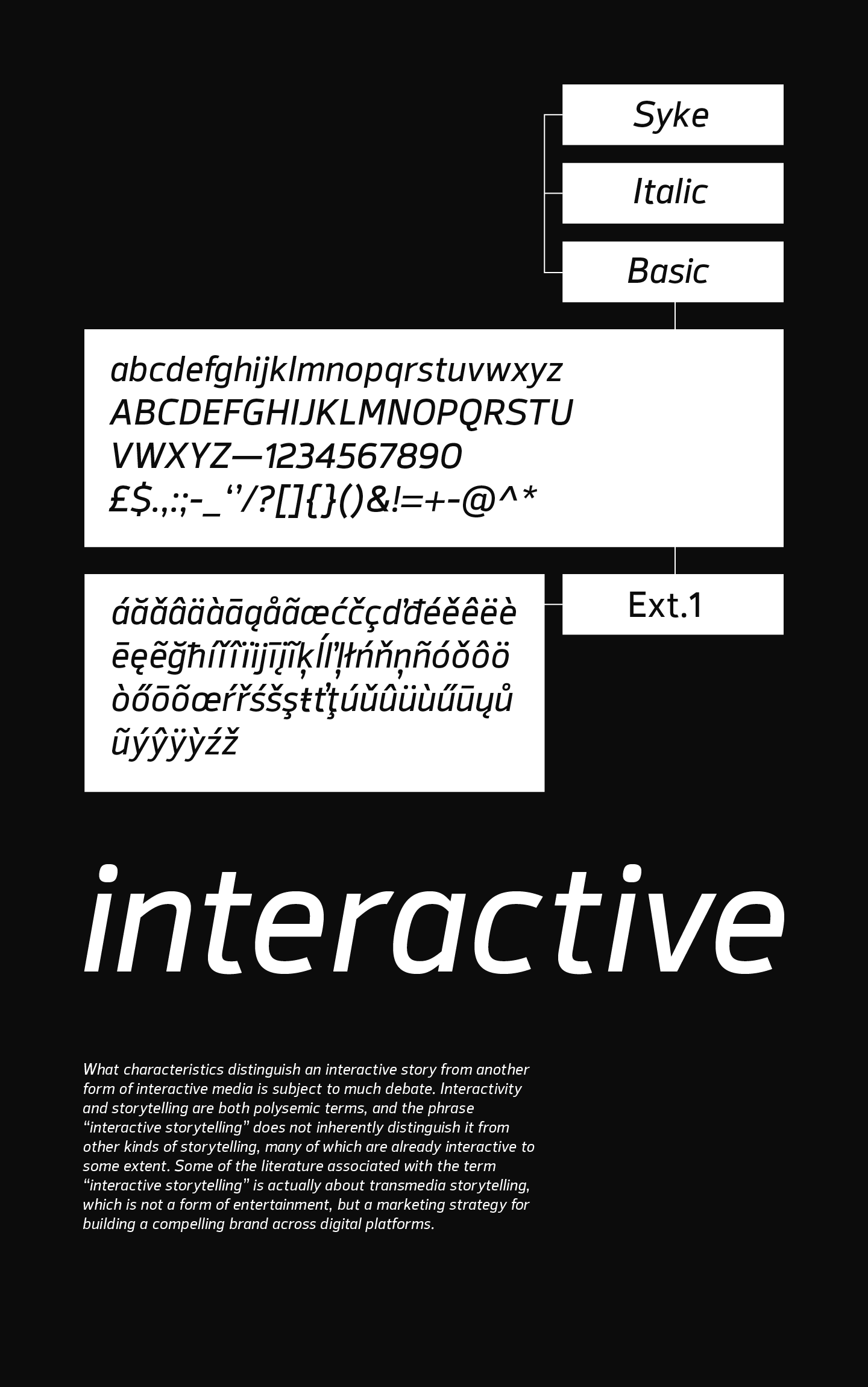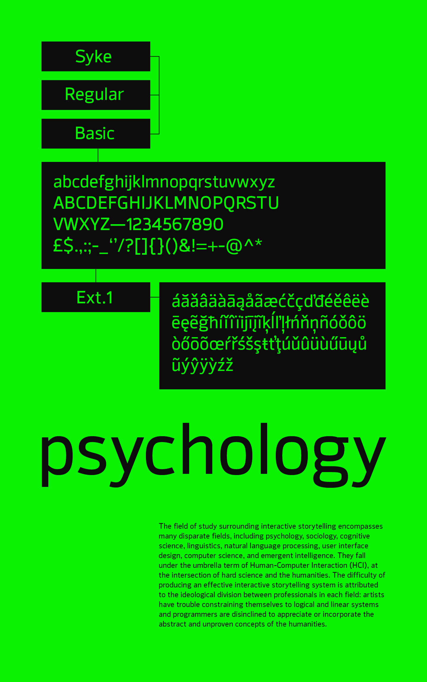 A versatile sans serif typeface that combines both humanist and geometric concepts. The blend of narrowly rounded letter shapes with subtle square detailing create a design ideally suited for typographical work in a digital application. Syke has a distinctive character without being overwhelming, making it ideal for film titles, user interfaces and the web. Details include 570 characters, five variations of numerals, ligatures, manually edited kerning and Opentype features.