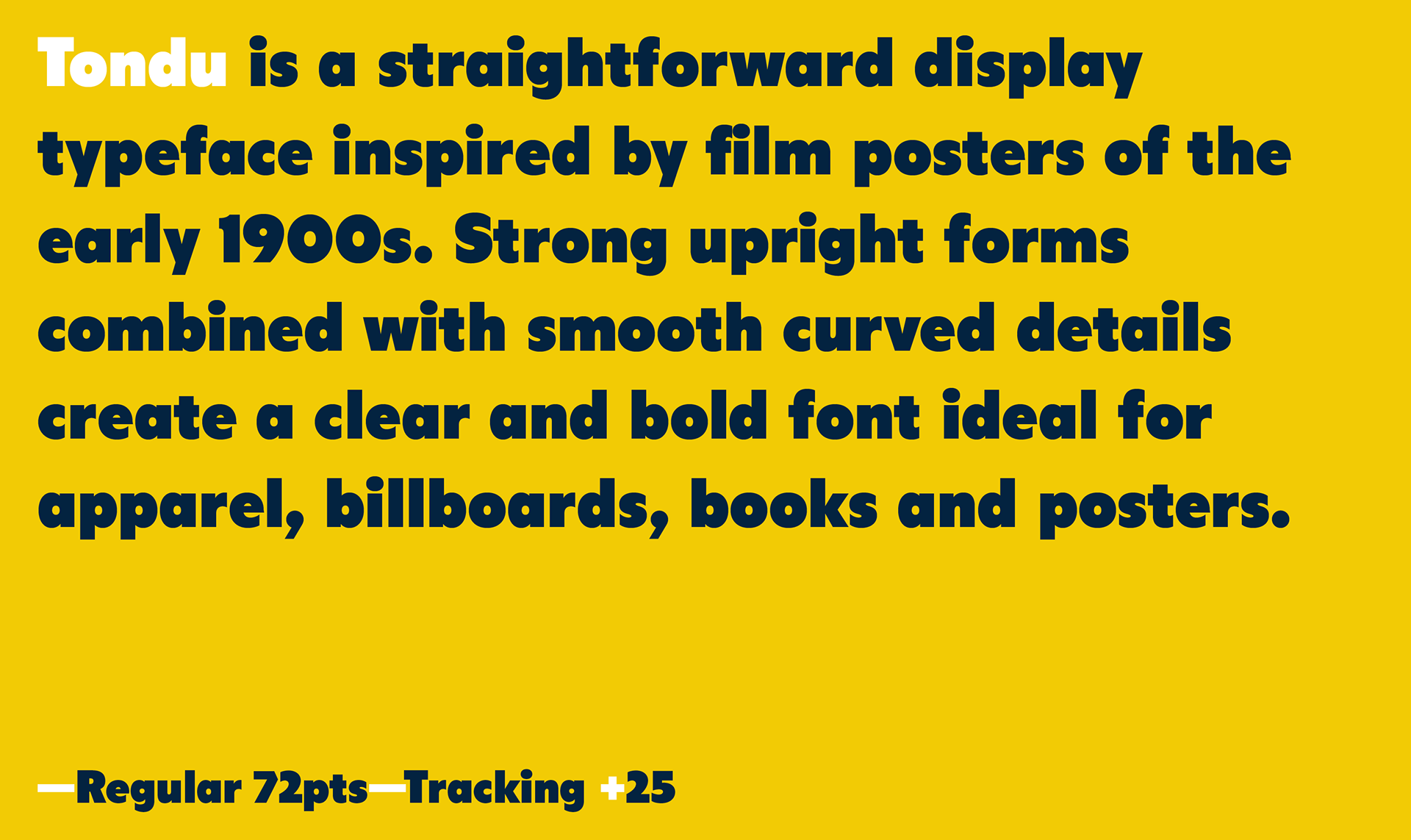 Tondu is a straightforward display typeface inspired by film posters of the early 1900s. Strong upright forms combined with smooth curved details create a clear and bold font ideal for apparel, billboards, books and posters.