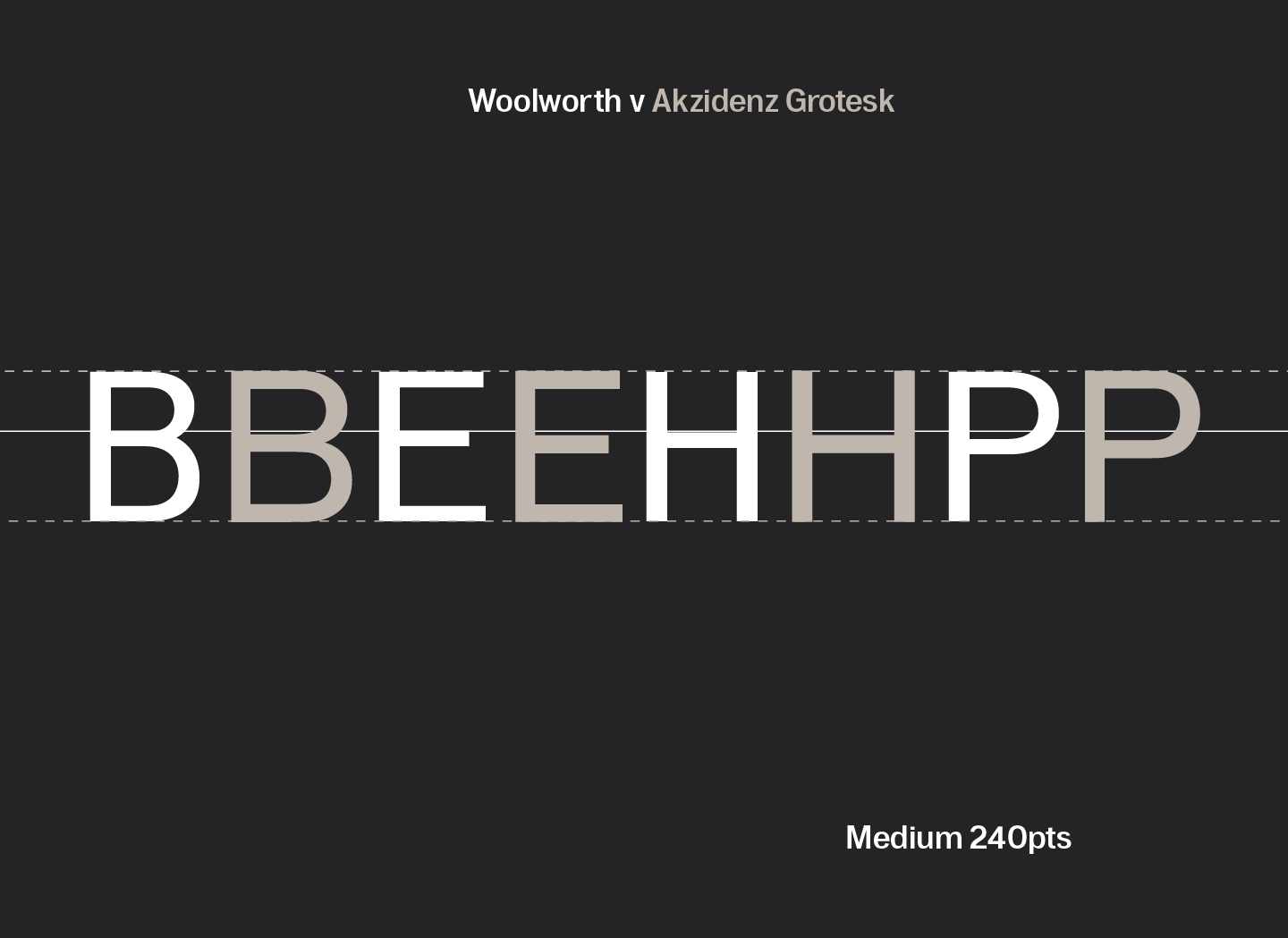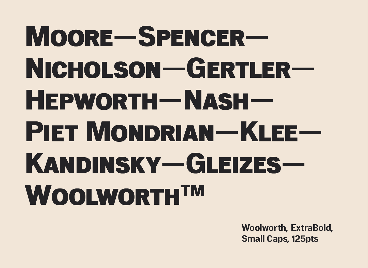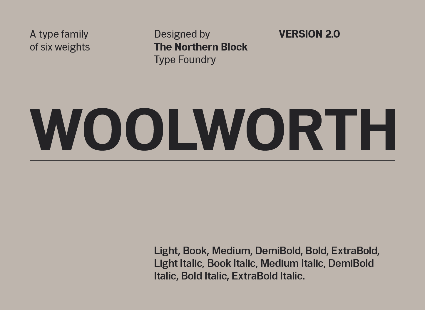 Woolworth is a modern sans serif font inspired by the grotesque designs of the late 19th century. Each letter has been developed with careful attention towards balance and purity of form, creating a clean, functional and optically correct typeface. These handcrafted details make a warm personality throughout the design without any single character being too overwhelming. It's a contemporary grot typeface fully equipped to tackle various text setting scenarios. Details include seven weights and italics, over 600 characters with alternative lowercase a, e, g, and basic punctuation. Open type features include seven variations of numerals, small caps, ligatures, and language support covering Western, South and Central Europe.